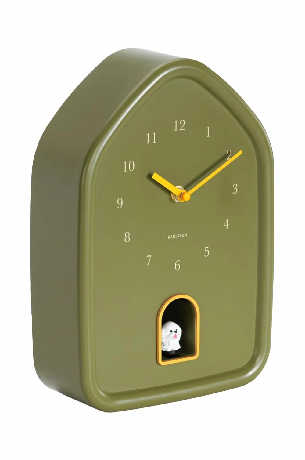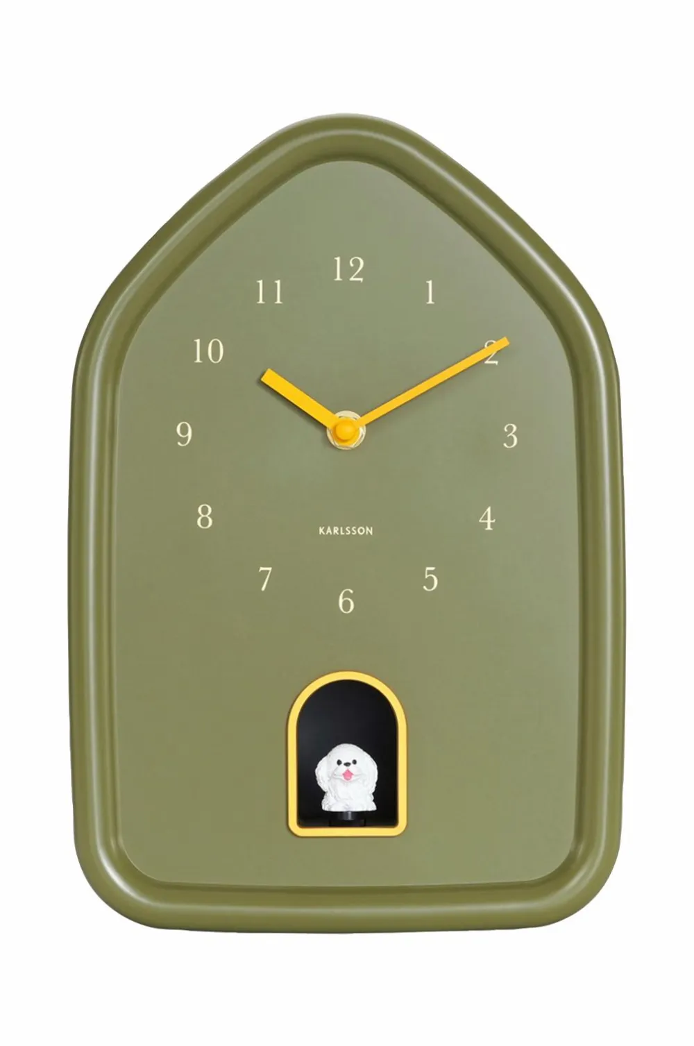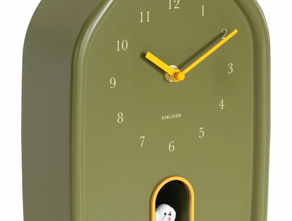 Et ur fra modern med en overraskende detalje: hver time på slaget gør en lille, fræk hund sin tilstedeværelse og sin lyd gældende. Den slanke silhuet og de diskrete gulddetaljer gør dette design til et stilfuldt supplement til ethvert rum. Med sine bløde kurver og varme udseende passer uret perfekt til temaet med naturlig glød. Et legesygt design med karakter, der bringer et smil frem hver gang hunden gøer.