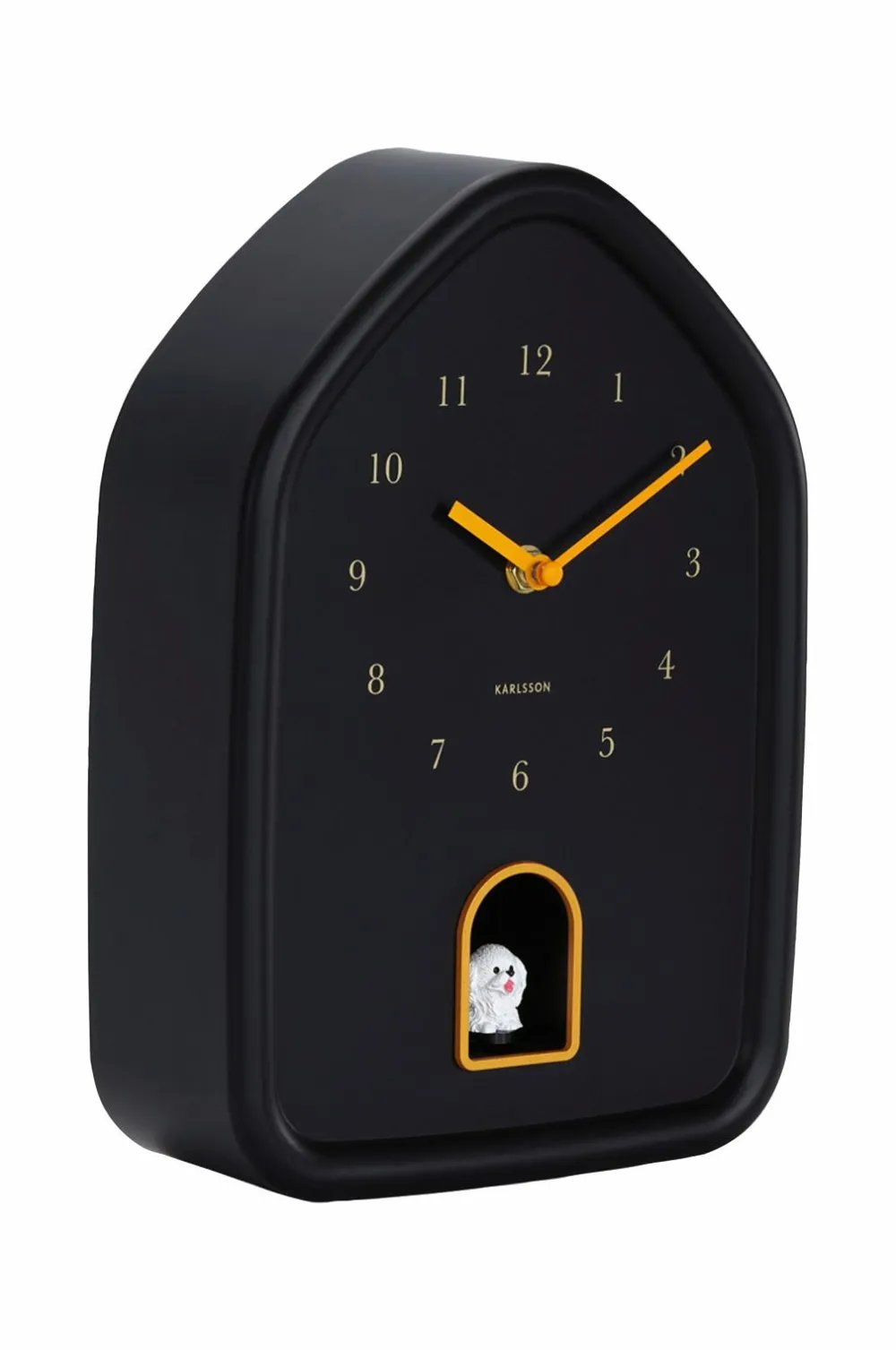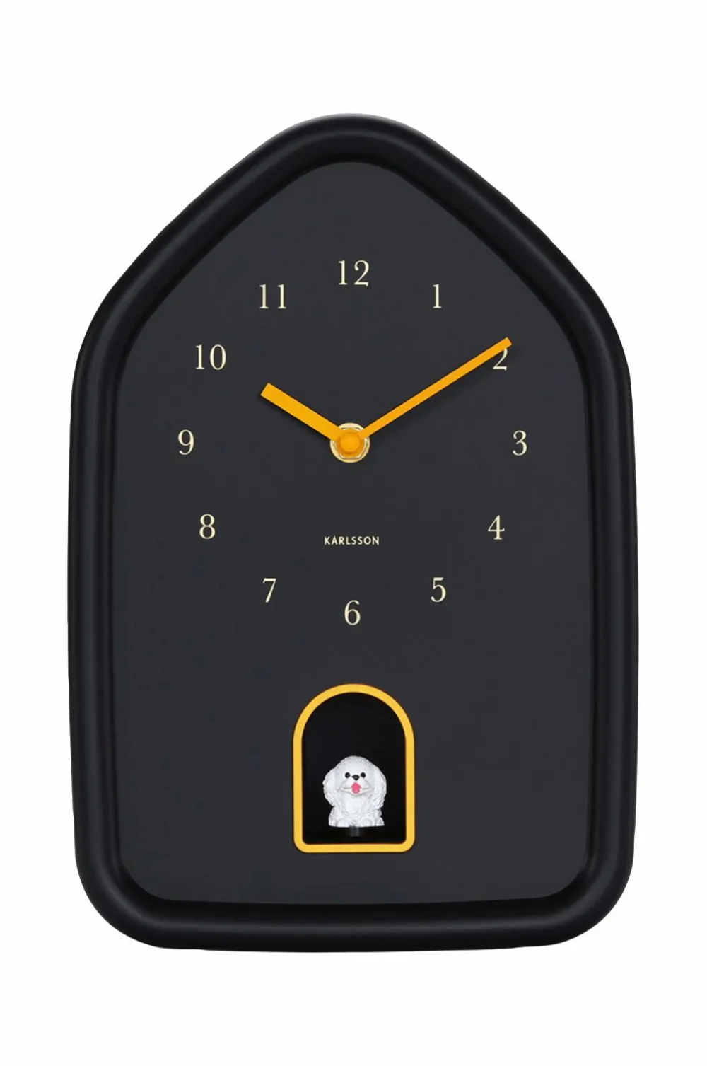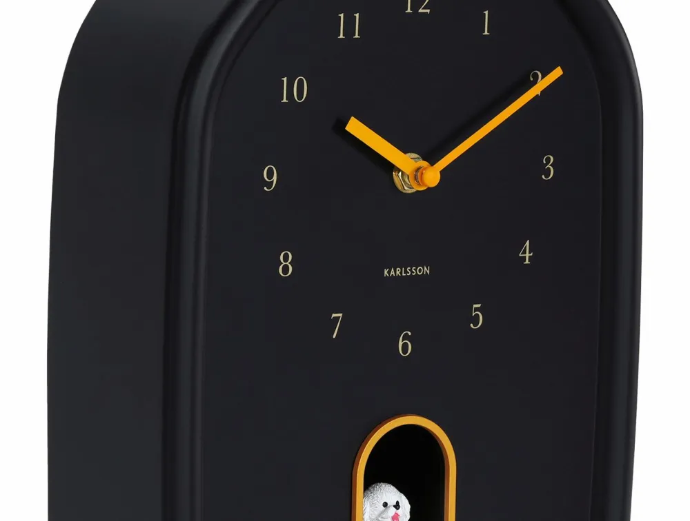 Et ur fra modern med en overraskende detalje: hver time på slaget gør en lille, fræk hund sin tilstedeværelse og sin lyd gældende. Den slanke silhuet og de diskrete gulddetaljer gør dette design til et stilfuldt supplement til ethvert rum. Med sine bløde kurver og varme udseende passer uret perfekt til temaet med naturlig glød. Et legesygt design med karakter, der bringer et smil frem hver gang hunden gøer.