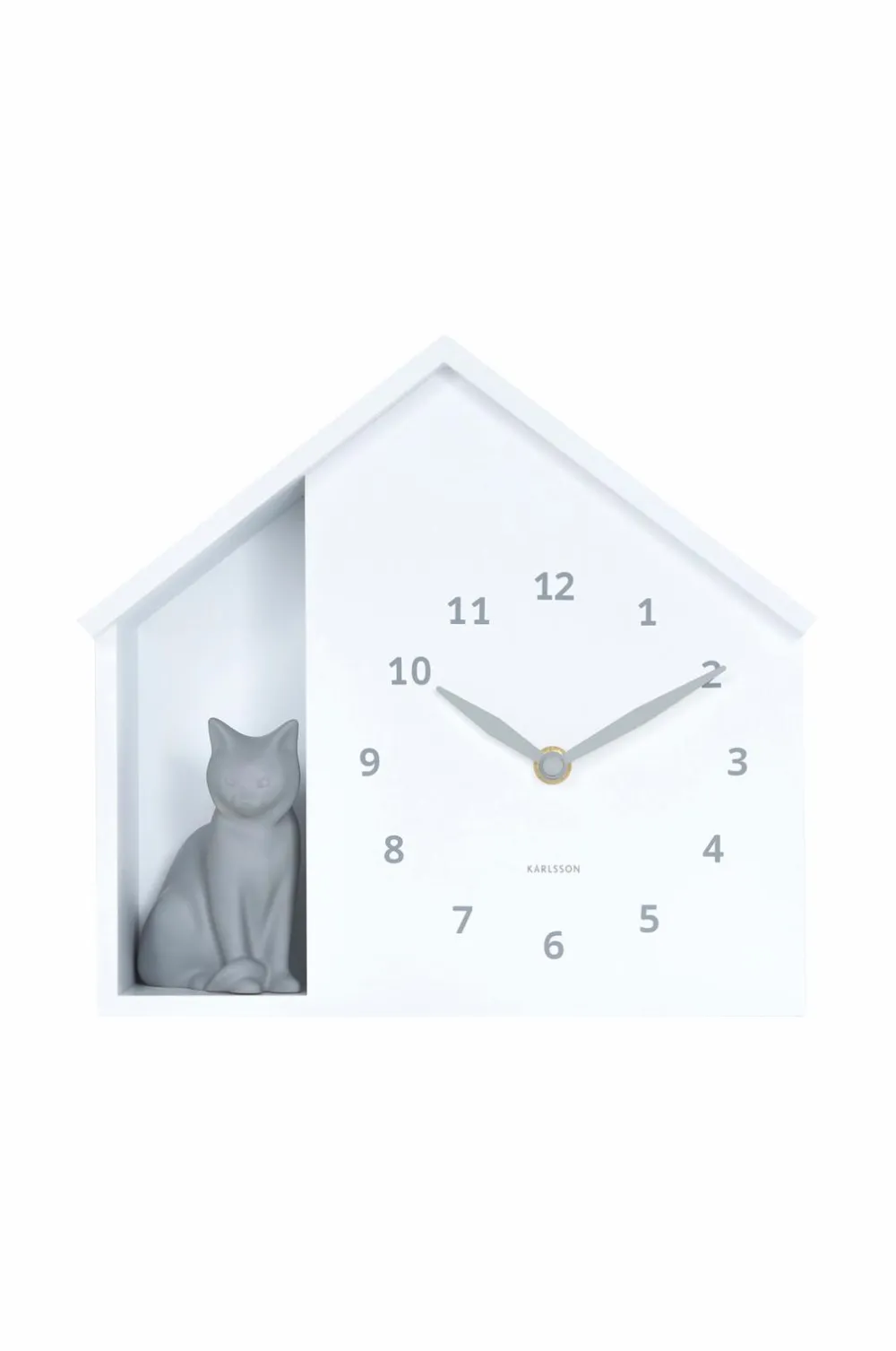 Stilfuld og legende: Karlssons sitting cat vægur er et rigtigt blikfang for cat elskere. Den yndefulde cat sidder tålmodigt i sit hjem og miaver hver time. Med sit minimalistiske design og bløde linjer passer dette ur perfekt ind i et moderne eller skandinavisk interiør. En charmerende tilføjelse til enhver væg.