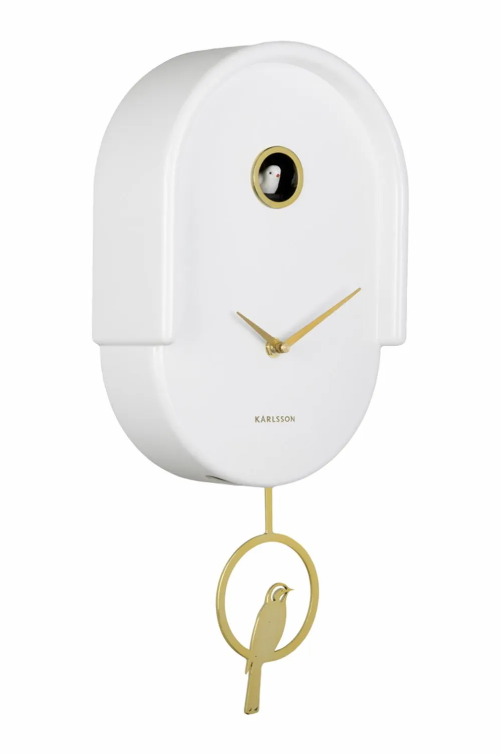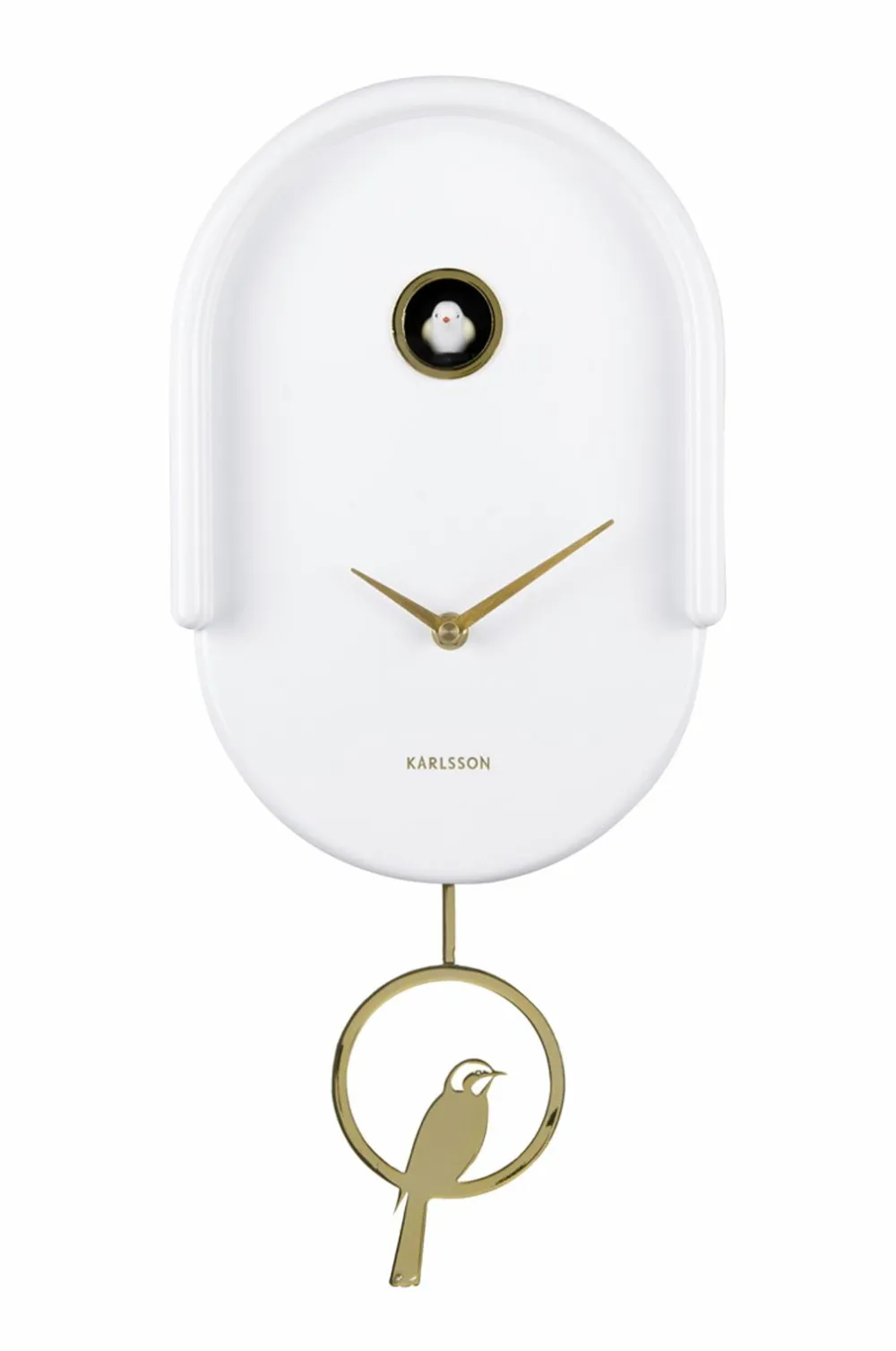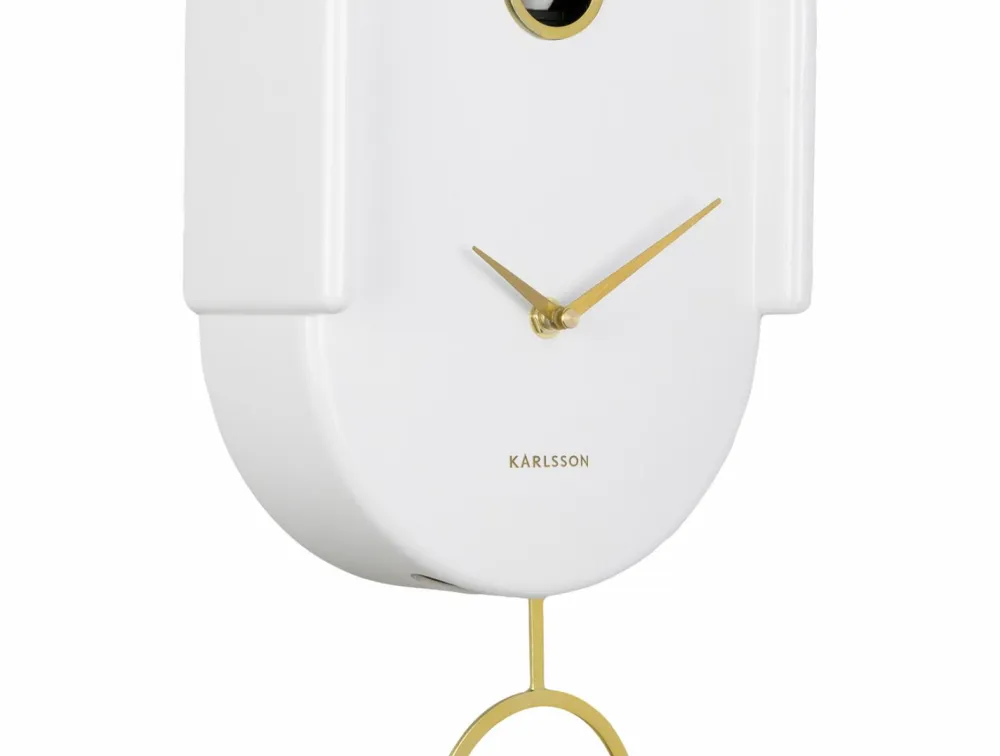 Design med karakter. Karlssons vægur ” tweet “, designet af Callum Macsorley, udstråler luksus med sin blanke finish og raffinerede detaljer. Uret har et pendul og en elegant fugleakcent, der kommer til live på bestemte tidspunkter. De runde former og guldfarvede elementer giver det et legesygt, men stilfuldt look. Et slående objekt, der helt sikkert vil appellere til designelskere.