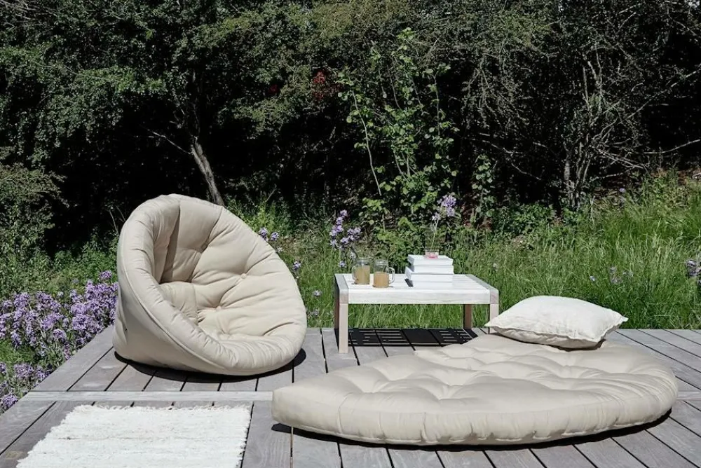 Håndlavet i Europa fold . Unfold . Oplev den ultimative udendørs afslapning med nido out™ fra karup design. Denne futonstol er perfekt til at skabe hyggelige stunder på terrassen, i haven eller endda på stranden. Med det smarte foldbare design kan du nemt forvandle nido fra en behagelig stol til en blød madras, hvor du kan slappe af og nyde solen. Betrækket er lavet af dralon – et materiale, der er både smuds- og vandafvisende. Det gør nido out™ ideel til udendørs brug og sikrer, at den bliver ved med at se godt ud selv i skiftende vejr. For at bevare holdbarheden anbefaler vi dog, at man tager den med indendørs, når det dugger eller regner. Alle vores futon-produkter er håndlavede, så der kan forekomme små variationer i størrelse og vægt.