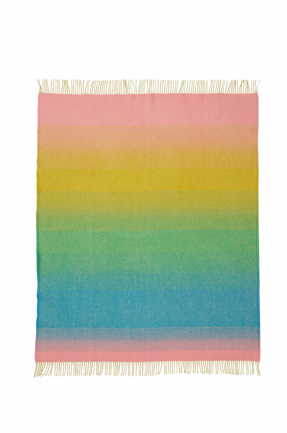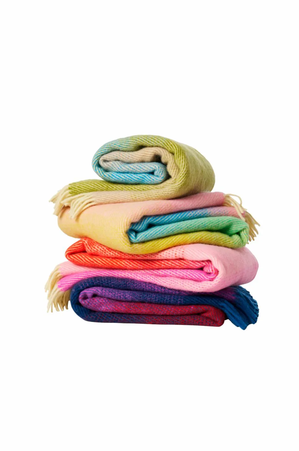 Aurora-tæppet i 100 % lammeuld leder tankerne hen på nordlysets magiske farvespil. Det er designet af Maxjenny og byder på bløde penselstrøg i pastelfarver, grøn-blå, rød-pink og blå-lilla. Uldens blødhed og de kunstneriske farver gør Aurora til et statement i indretningen.