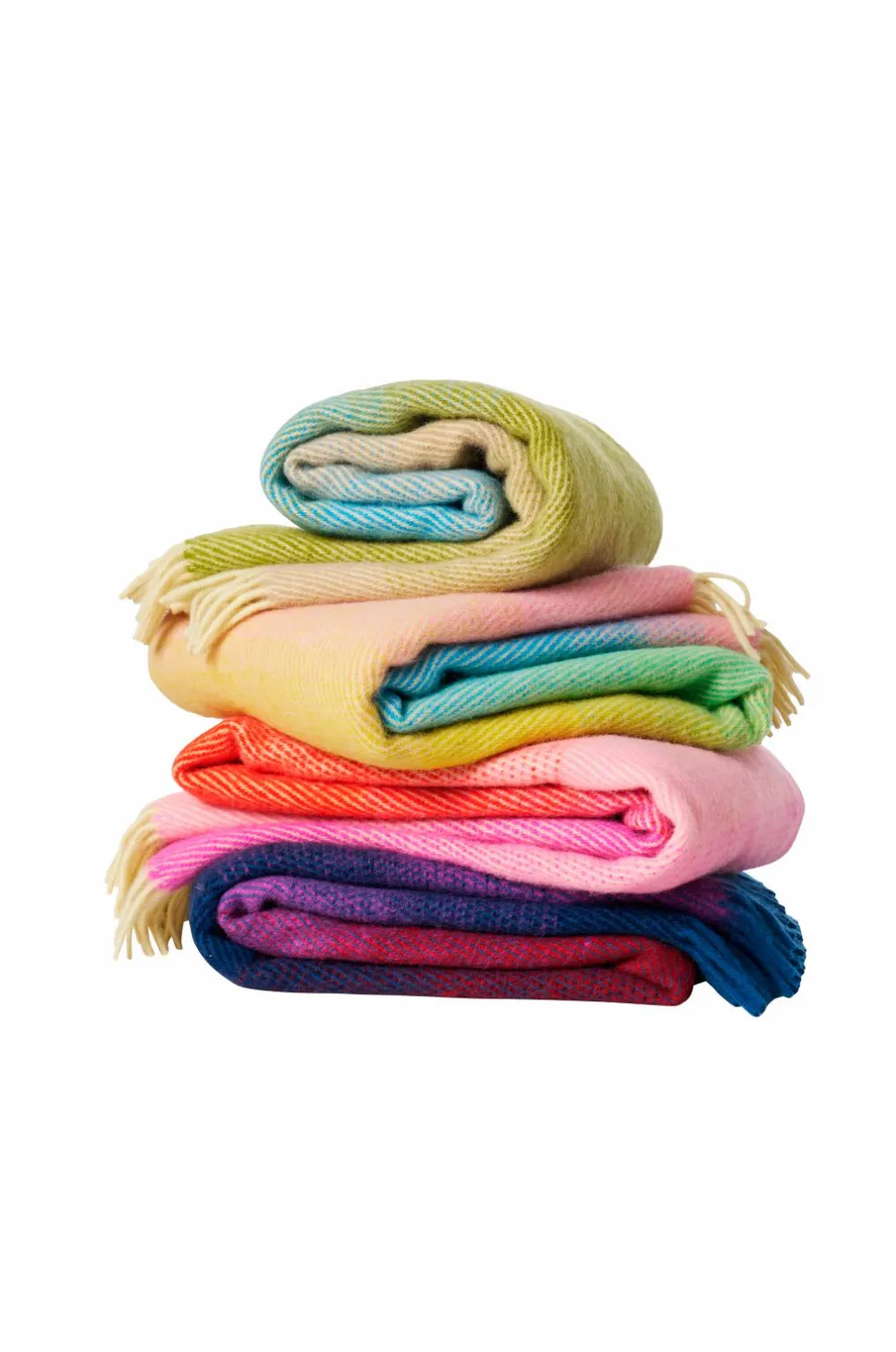 Aurora-tæppet i 100 % lammeuld leder tankerne hen på nordlysets magiske farvespil. Det er designet af Maxjenny og byder på bløde penselstrøg i pastelfarver, grøn-blå, rød-pink og blå-lilla. Uldens blødhed og de kunstneriske farver gør Aurora til et statement i indretningen.