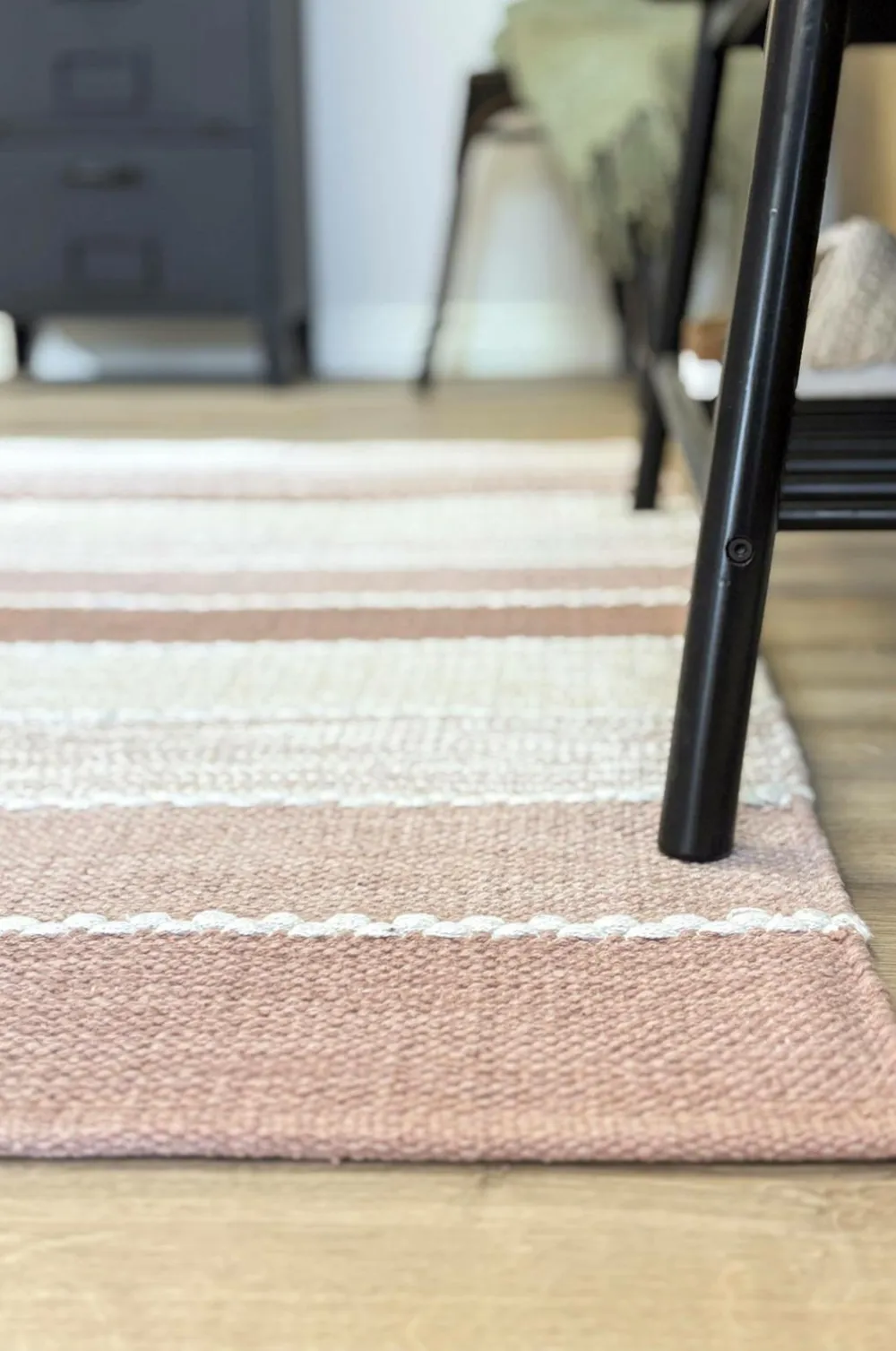 Lad tæppet tørre fladt, eller hæng det op i stribernes retning med flere linjer som støtte.