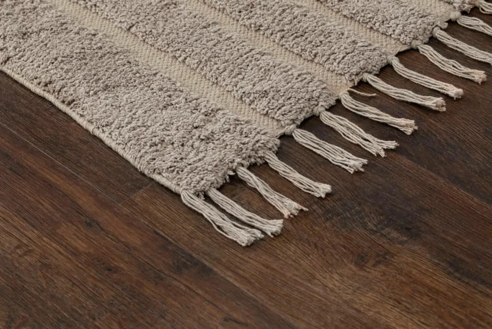 Morocco er et håndvævet tæppe i 100% bomuld, med sit tuftede mønster og knyttede frynser, giver det din indretning en hjemlig følelse. Gulvtæppet har høje og lave partier hvilket skaber et flot og afslappet tæppe i et uregelmæssigt mønster.
