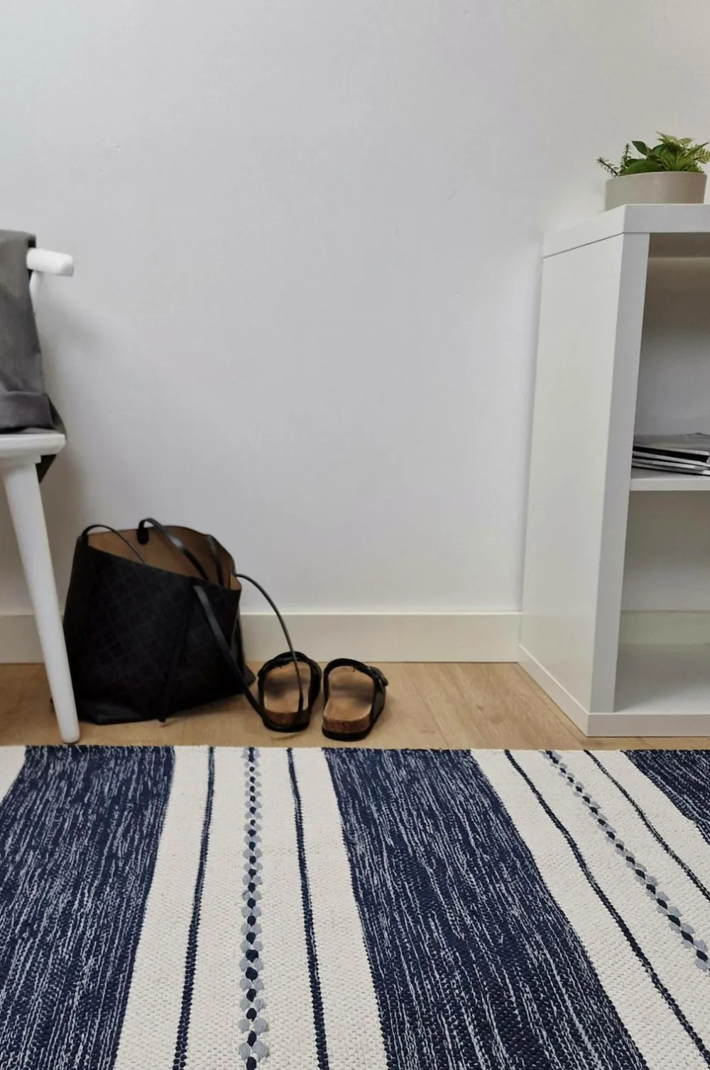 Dette er et håndvævet bomuldstæppe, hvilket betyder, at mønster og farve kan variere, hvilket gør hvert tæppe unikt. Tæppet er vævet i ren bomuld, hvilket gør det både blødt, slidstærkt og holdbart. Det skaber en hyggelig følelse, der giver liv og samtidig dæmper lyd.