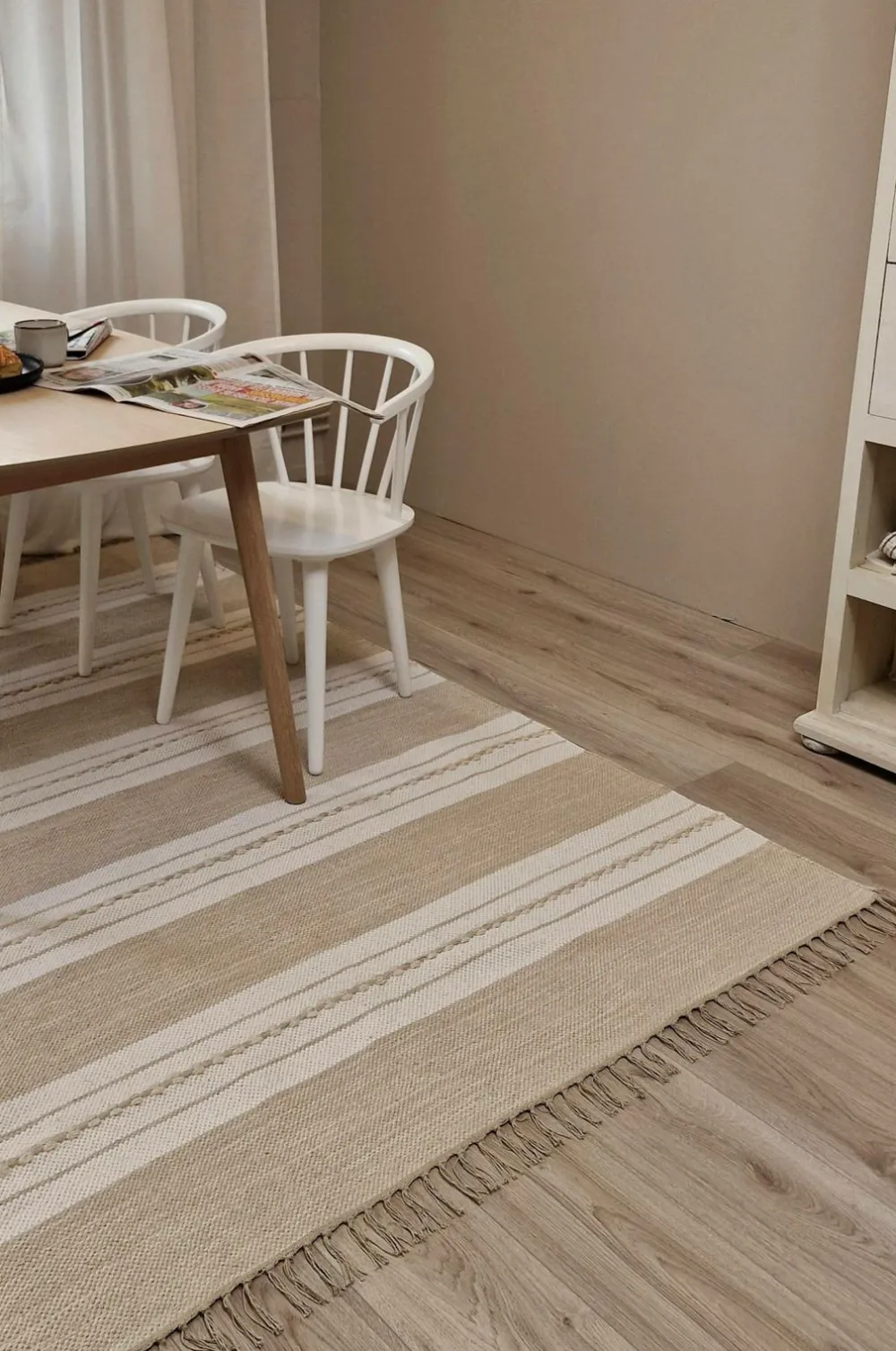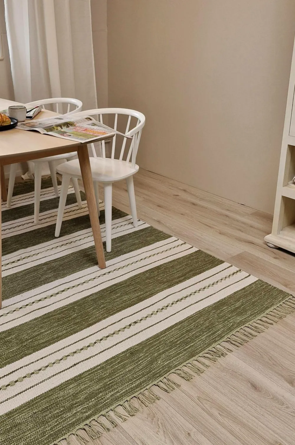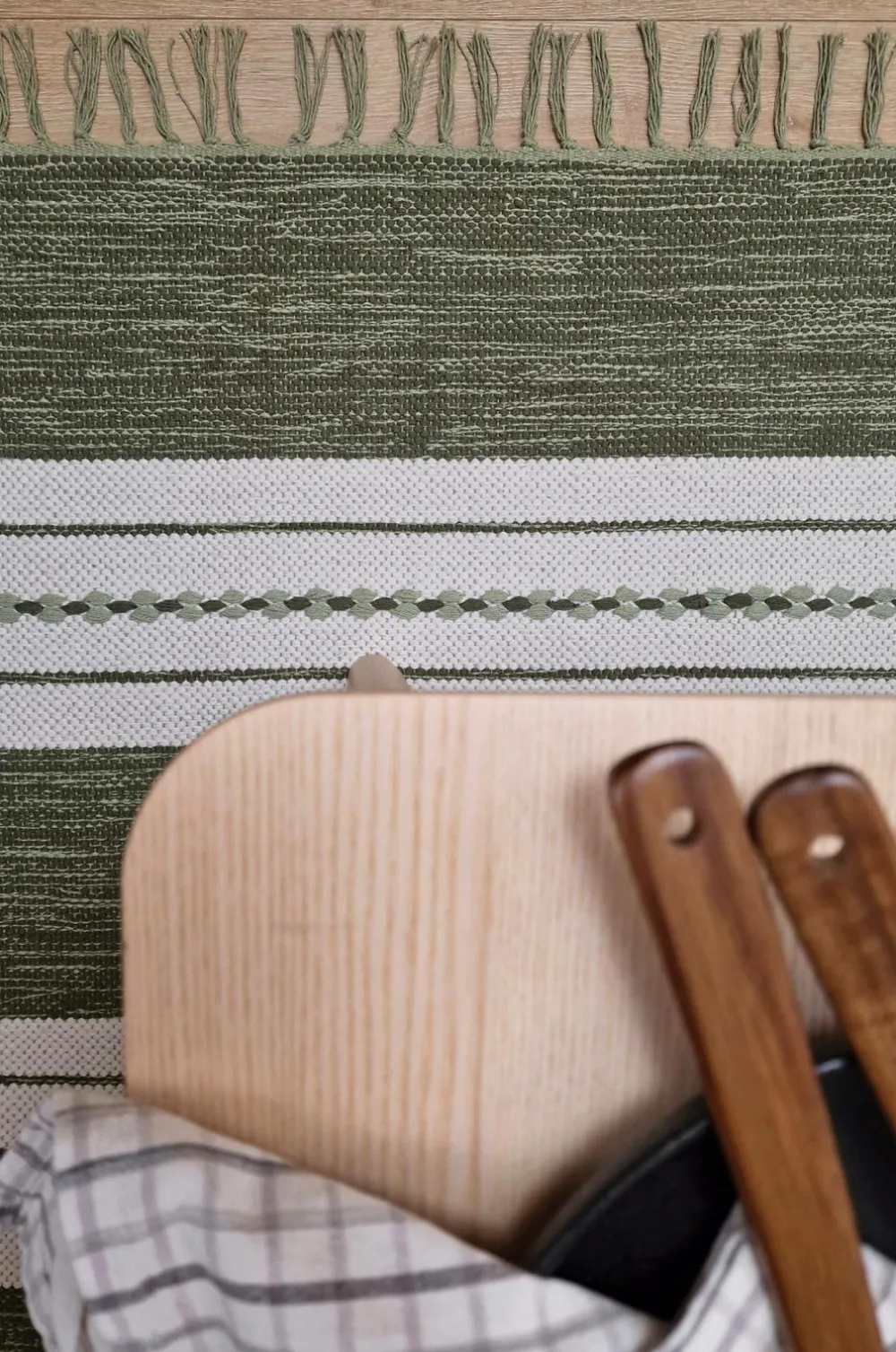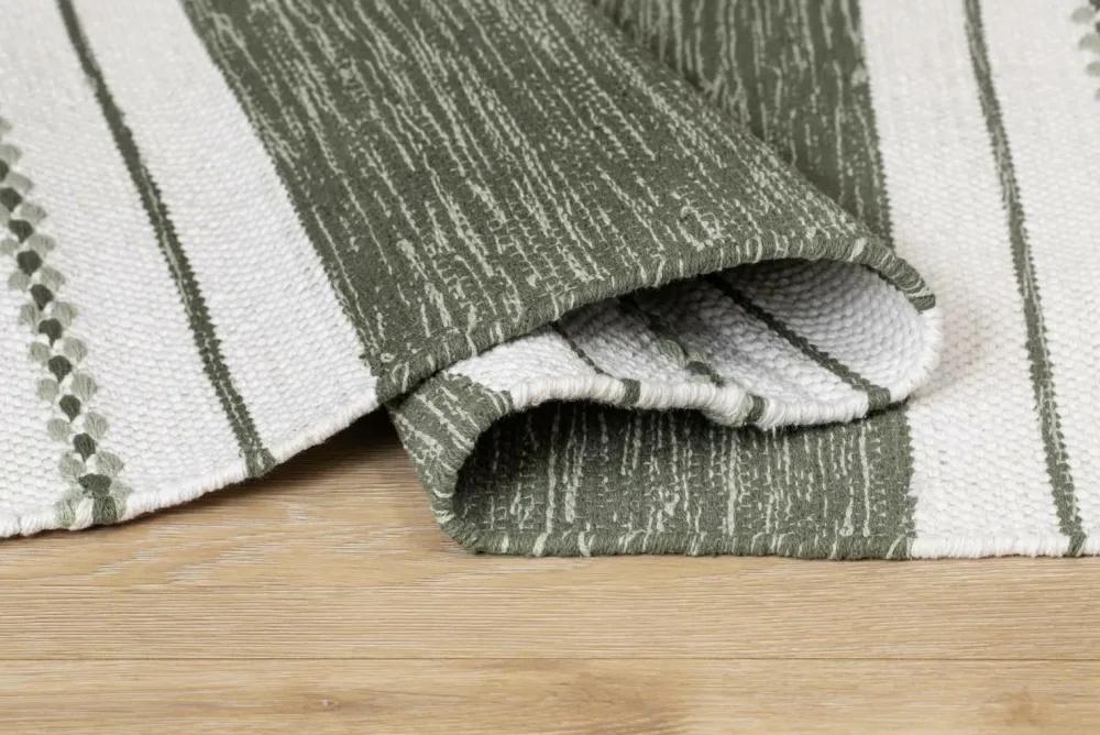 Dette er et håndvævet bomuldstæppe, hvilket betyder, at mønster og farve kan variere, hvilket gør hvert tæppe unikt. Tæppet er vævet i ren bomuld, hvilket gør det både blødt, slidstærkt og holdbart. Det skaber en hyggelig følelse, der giver liv og samtidig dæmper lyd.