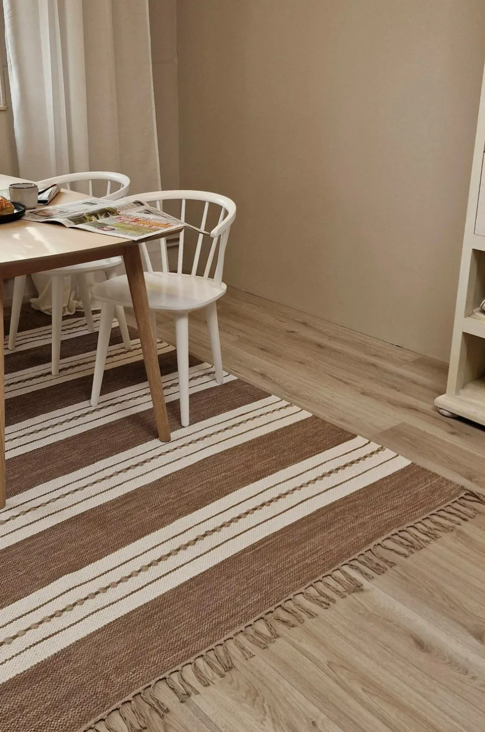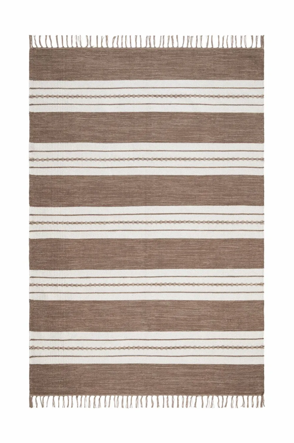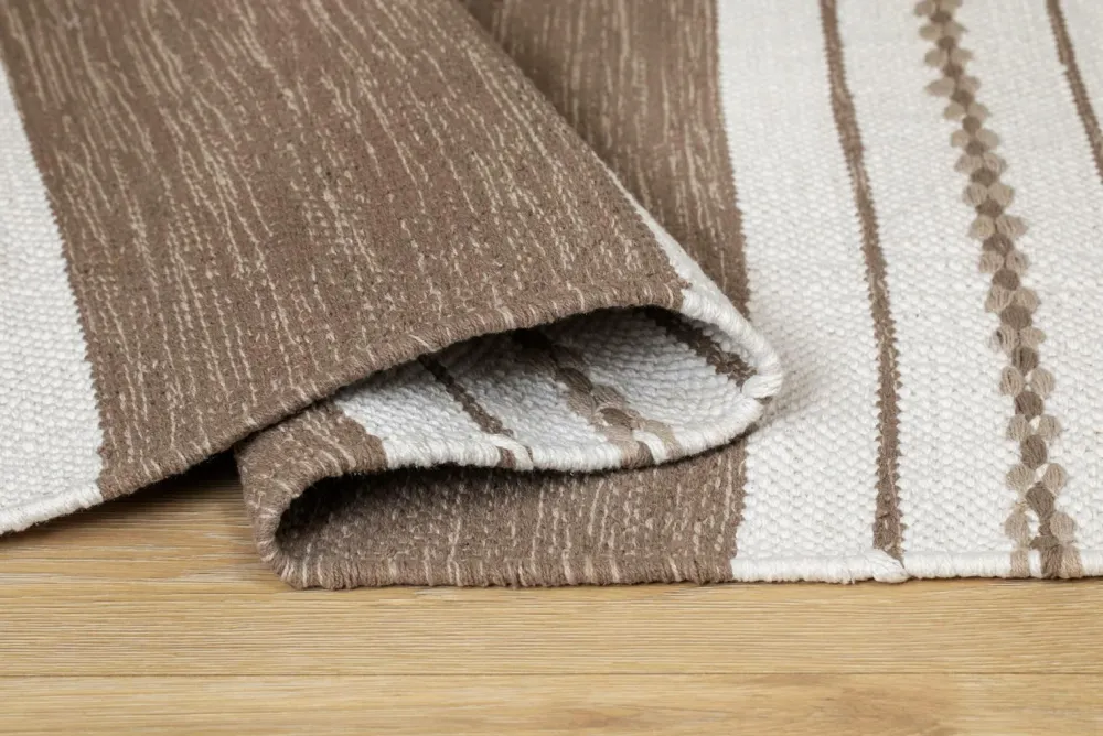 Dette er et håndvævet bomuldstæppe, hvilket betyder, at mønster og farve kan variere, hvilket gør hvert tæppe unikt. Tæppet er vævet i ren bomuld, hvilket gør det både blødt, slidstærkt og holdbart. Det skaber en hyggelig følelse, der giver liv og samtidig dæmper lyd.