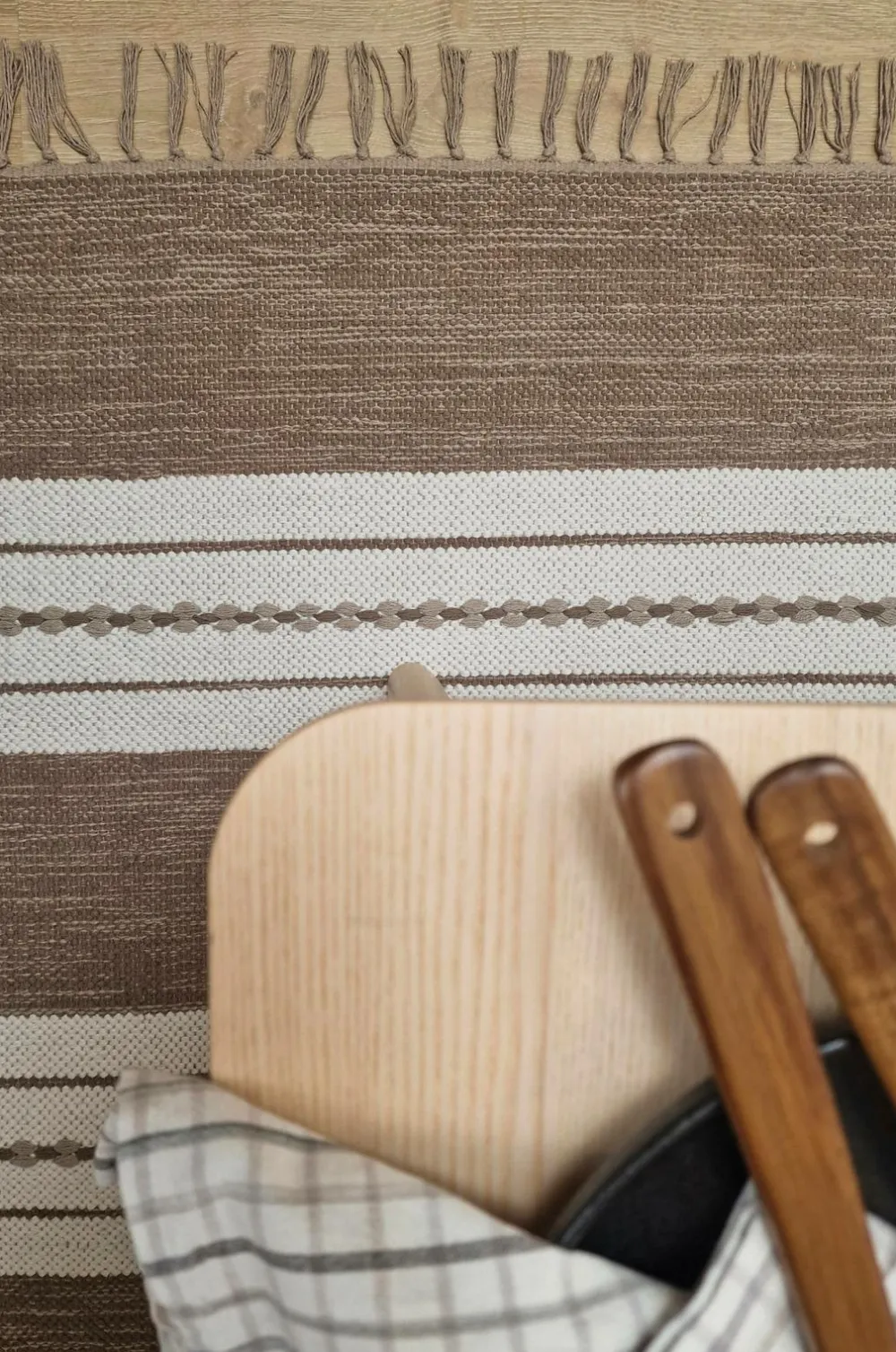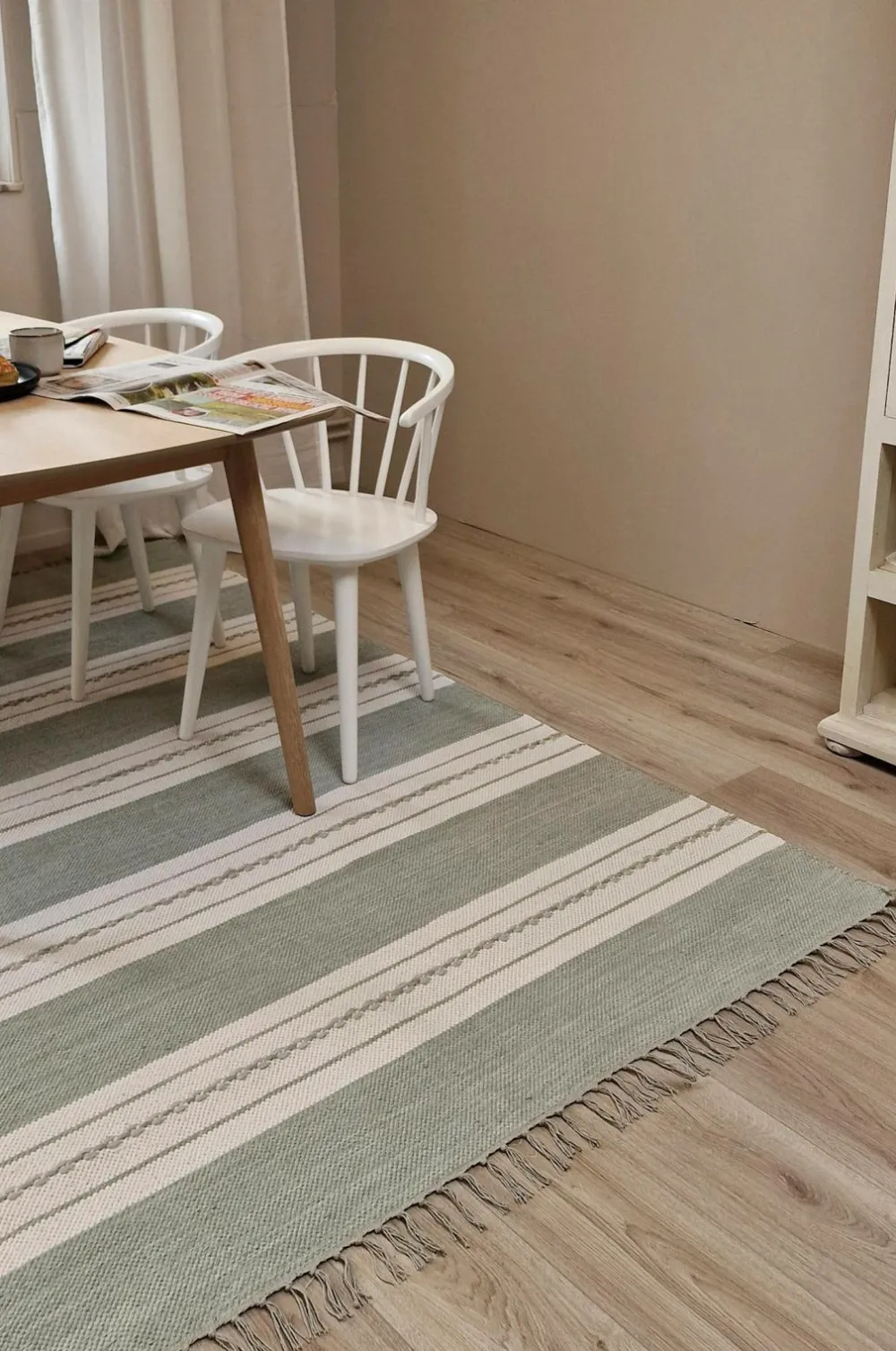 Yarn carpet sund er en serie stribede bomuldstæpper med de klassiske frynser. Da sund er vendbar og kan bruges på begge sider, giver det tæppet en lang levetid, fordi man på den måde får to tæpper i ét. Garntæpper er et klassisk element i det svenske hjem og passer lige så godt i køkkenet som i soveværelset eller entreen.