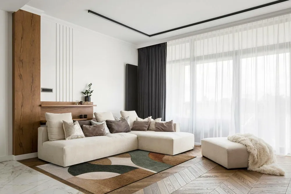 Brilliance er et maskinvævet tæppe med klippet luv, fremstillet af en blanding af polypropylen og polyester. Materialeblandingen gør det slidstærkt, let at pleje og modstandsdygtigt over for pletter, mens polyesteren giver blødhed og en diskret glans. Takket være det alsidige design er bern let at placere i hjemmet – uanset om det er i stuen, under en læsestol eller som et blødt element i soveværelset.