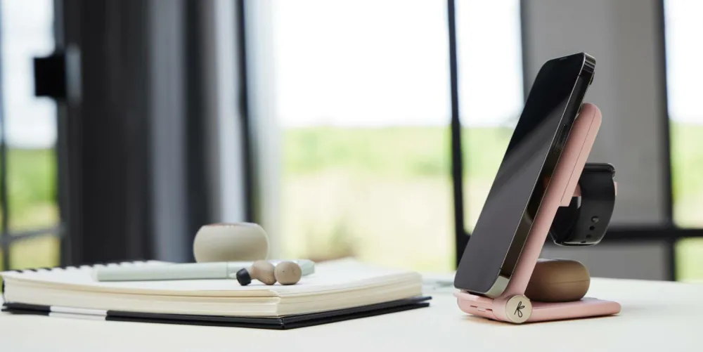 reCHARGE+ er en stående hurtigoplader med plads til to Qi-kompatible enheder, så du kan oplade mobiltelefonen, høretelefonerne og dit smartwatch samtidig. Mobiltelefonen lænes nemt op ad opladerens forside. Den øverste oplader på bagsiden fungerer kun til Apple Watch, mens øvrige Qi-ure kan oplades på den nederste opladningsoverflade. Opladeren kan foldes sammen, så du let kan tage den med dig, når du er på farten.