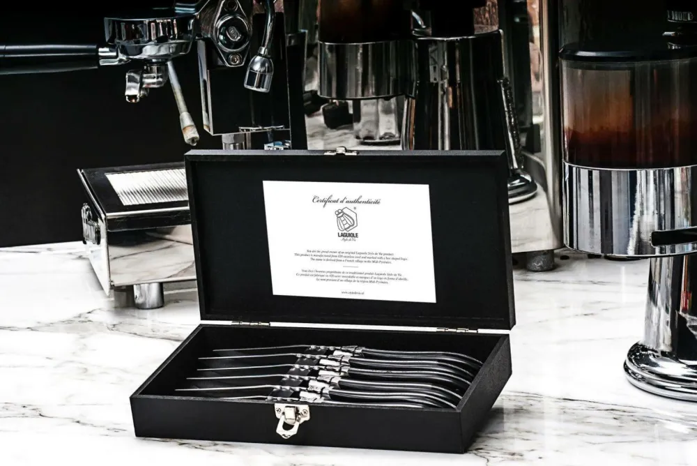 Luksus steakknive med sort ibenholt-finish. En set med 6 skarpe steakknive af høj kvalitet med en bladtykkelse på 2,5 mm. Leveres i en luksuriøs sort æske. Steakknivene fra luksusserien tåler ikke opvaskemaskine.