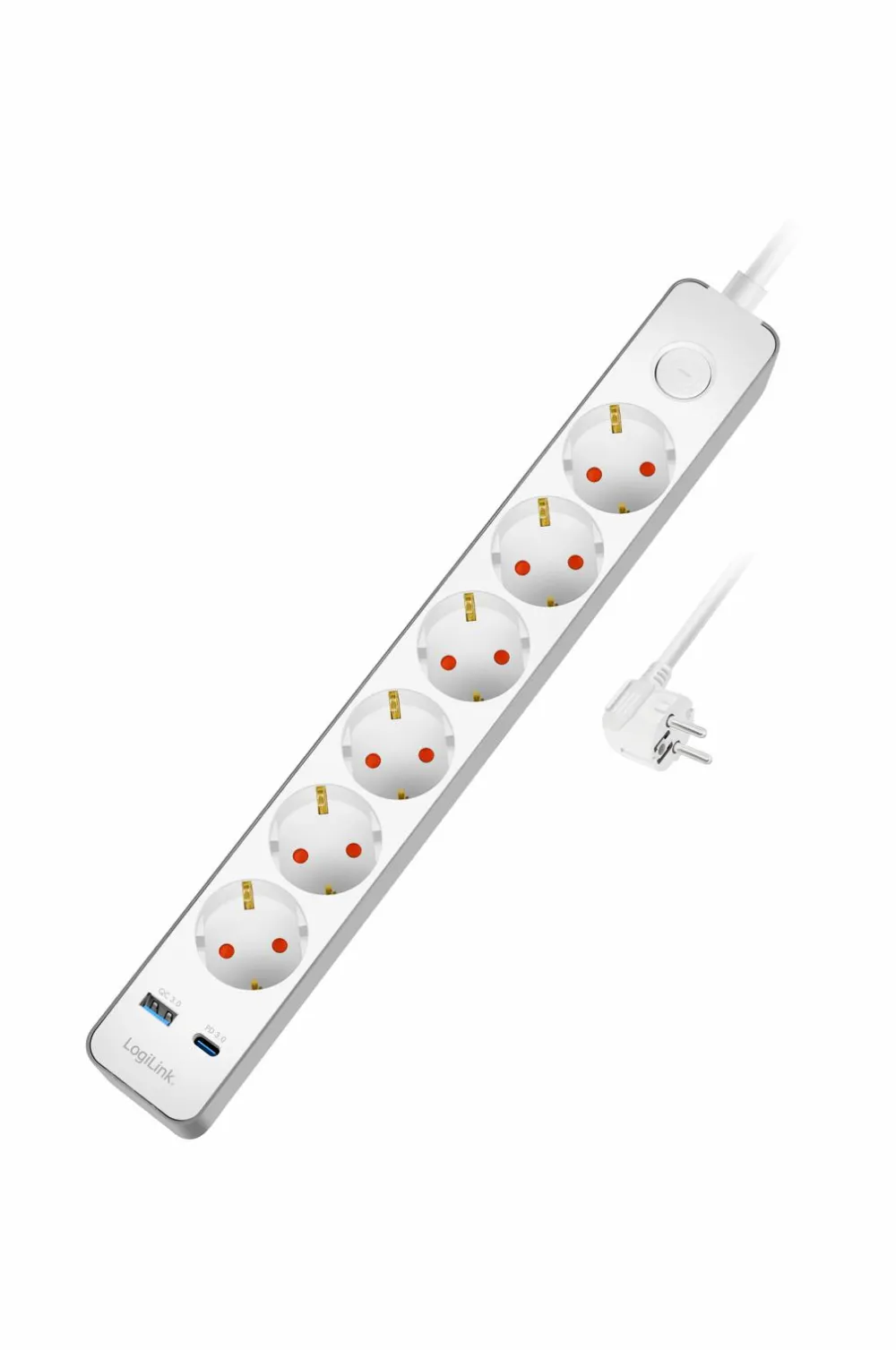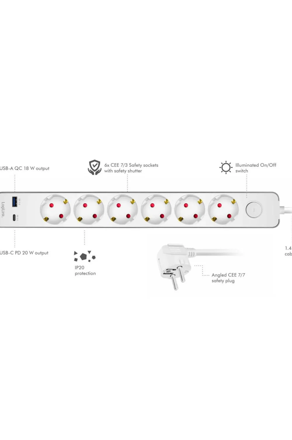 • LogiLink 6-stikdåse med USB-C PD 20W- og USB-A QC-opladningsporte