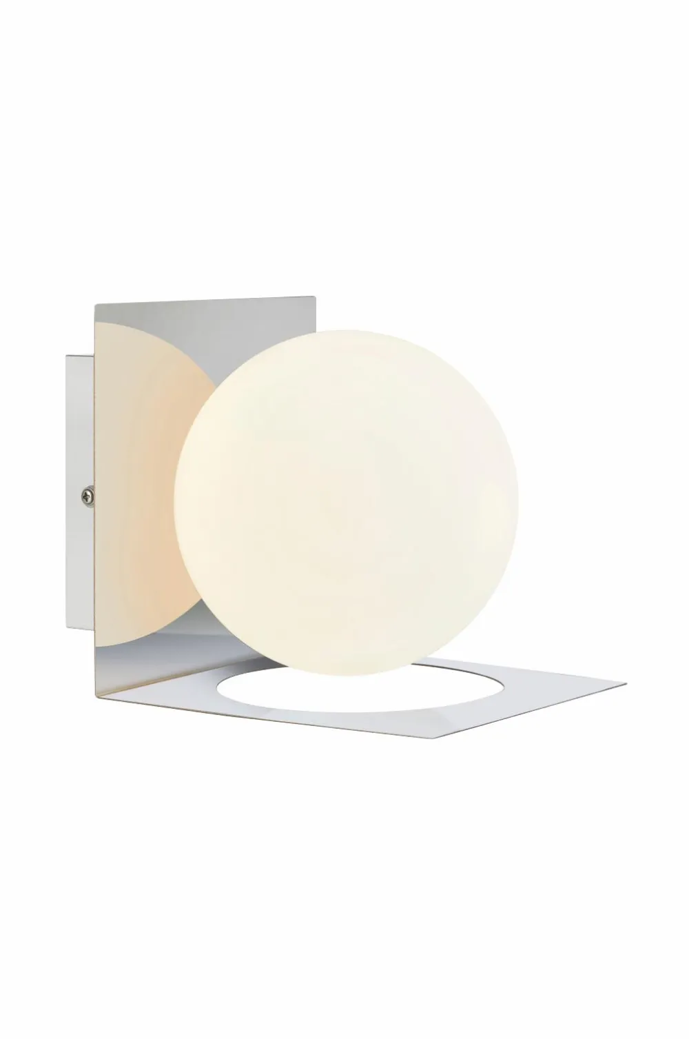 Væglampe godkendt til badeværelser. Hvid matteret glaskuppel på en base i forkromet metal. Til fast installation. Maks. 1x18W. G9-fatning (medfølger ikke). 14 cm bred og høj.