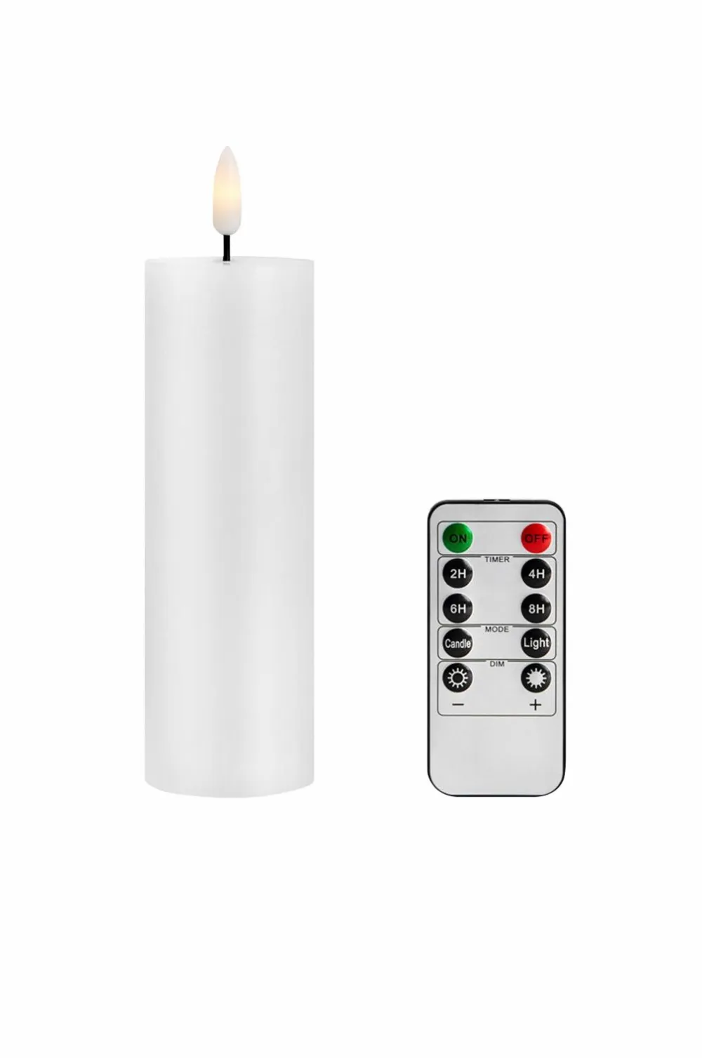 Fjernstyret led block stearinlys i voks fra markslöjd. 2,4,6 og 8 timers timerfunktion. Justerbar lyseffekt, konstant eller flamme. Konstant lys i 4 dæmpbare trin. 18 cm højt. Kontakt under lyset. Drives af 2xaa abtterier. Batterier medfølger ikke.