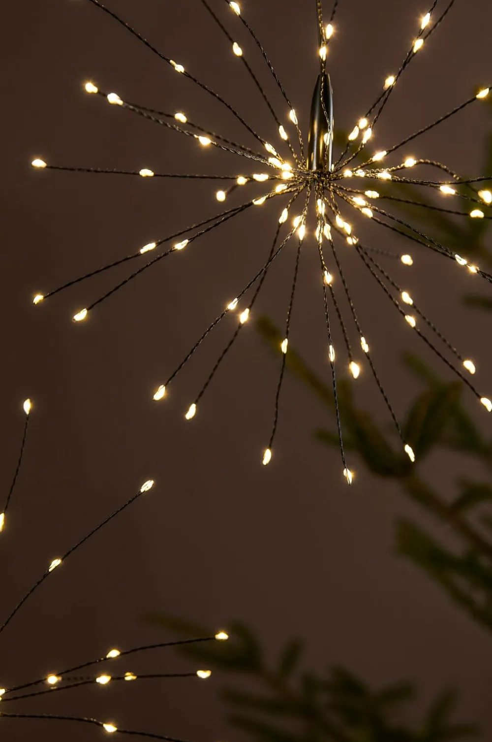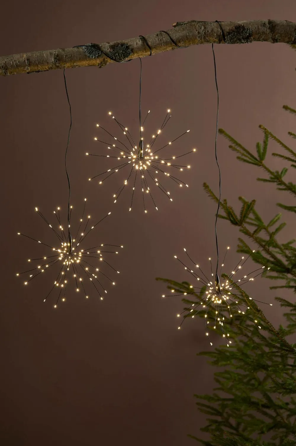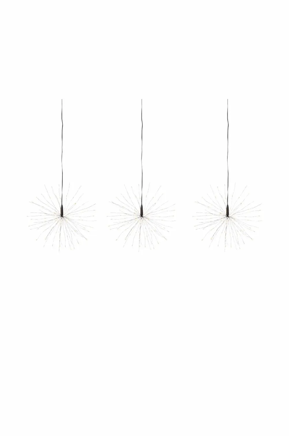 Meteor 3-sæt med 270 varmhvide integrerede LED-lys på 4,8W. Afstand mellem hver dekoration er 2 meter. 3 dekorationer på 25 cm. 5 meter kabel i plast, med elektronisk plug-in-transformator. Godkendt til udendørs brug.