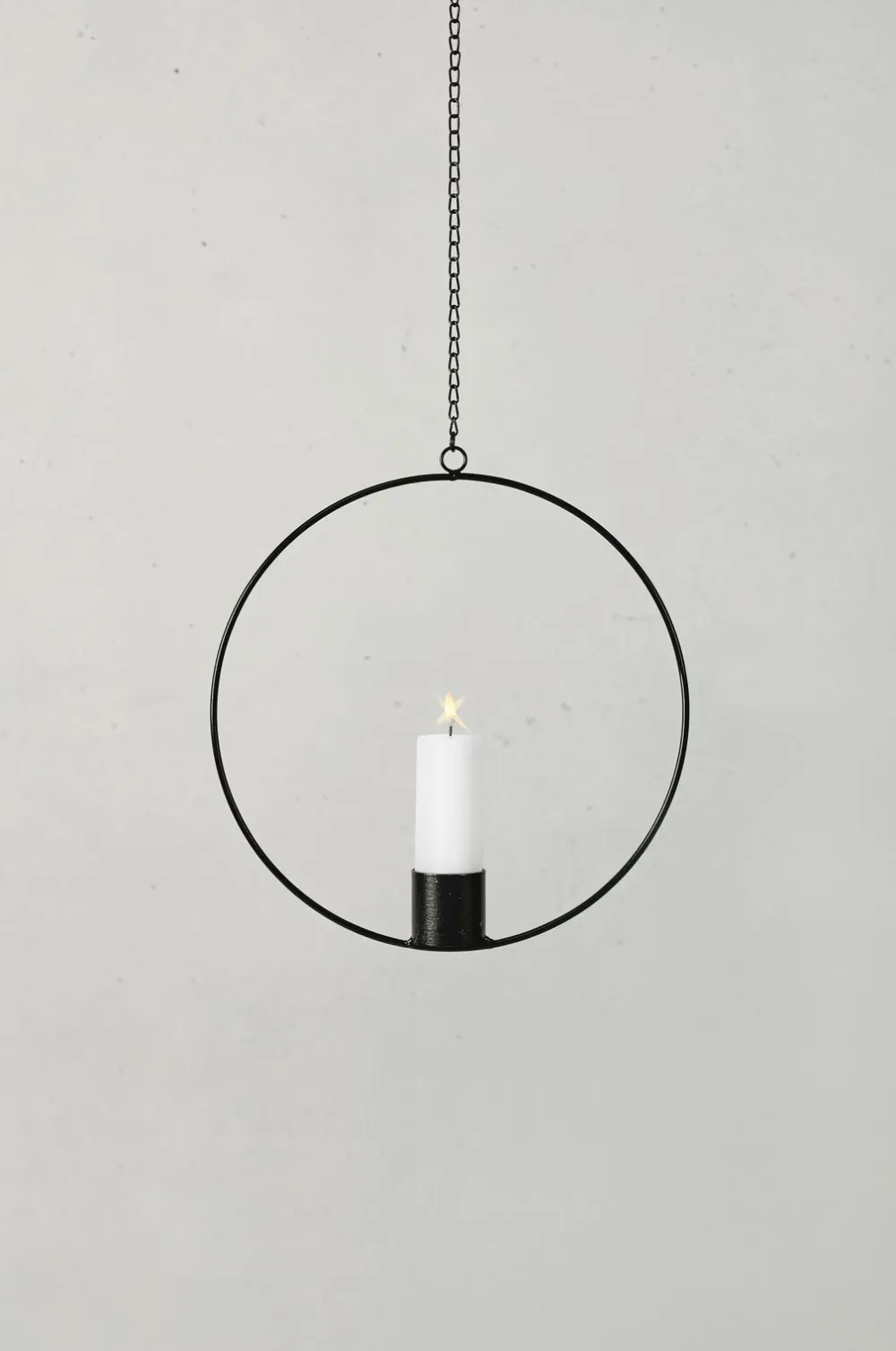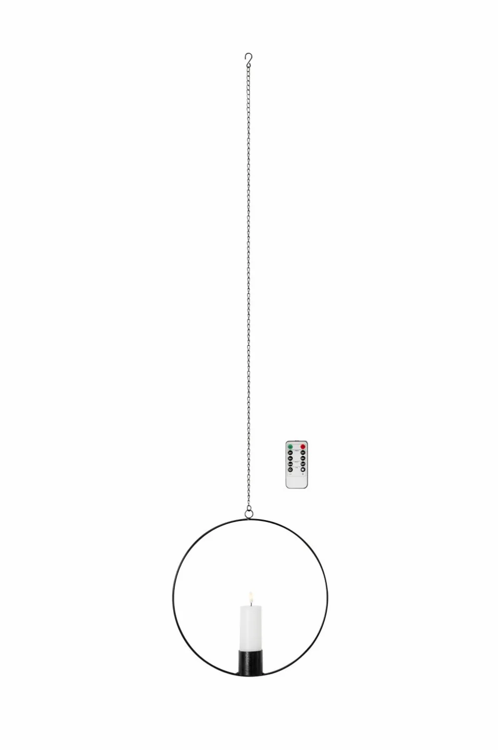 Anillo Hængende dekoration fra markslöjd. Ring i metal med 1,5 m metalkæde. 35 cm i diameter. Der medfølger fjernstyret led-bloklys i voks. 2,4,6 og 8 timers timerfunktion. Justerbar lyseffekt, konstant eller flamme. Konstant lys i 4 dæmpbare trin. 15 cm høj. Kontakt under lyset. Drives af 2xaa batterier. Batterier medfølger ikke.