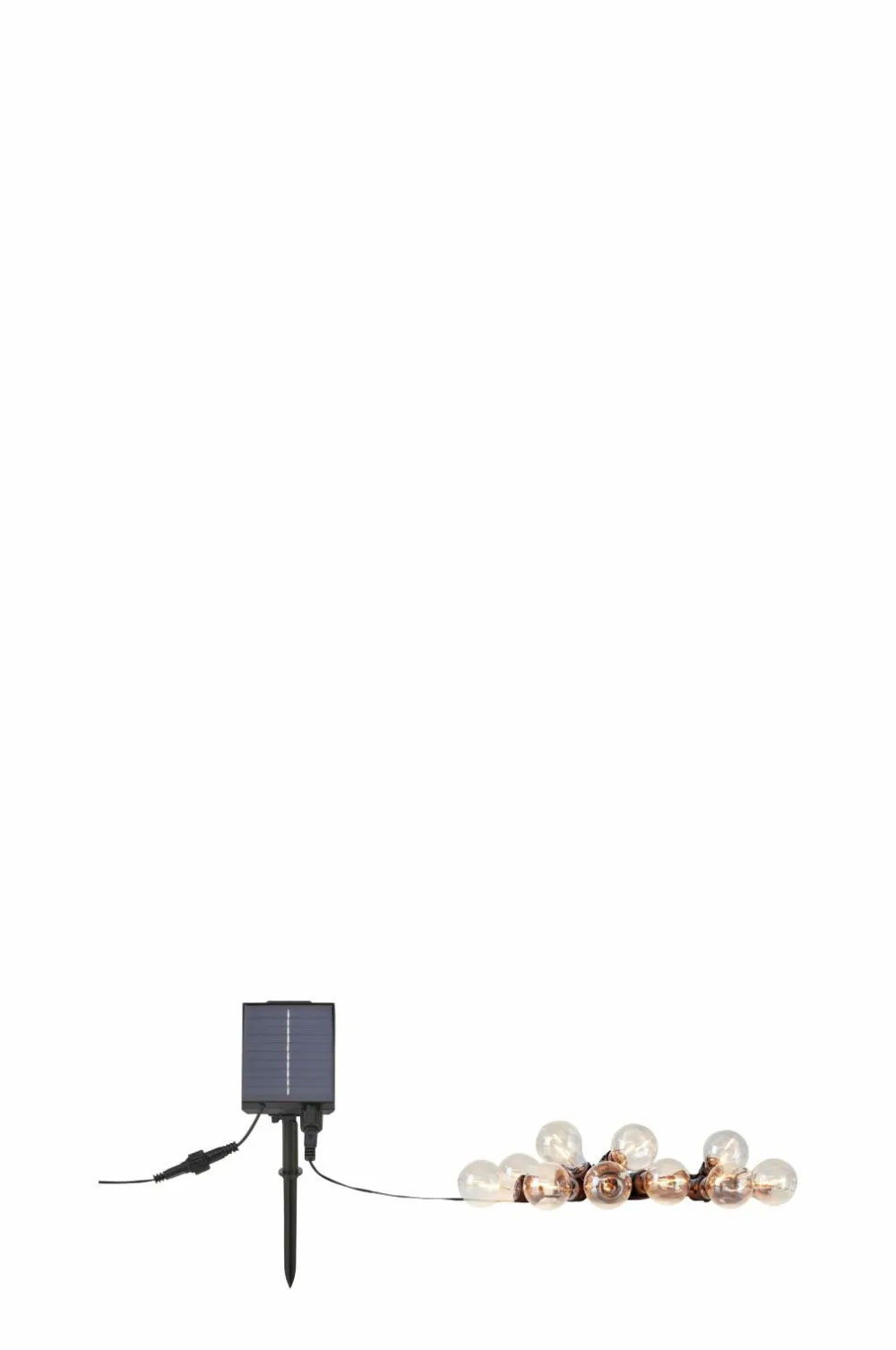 Suno Festkæde fra markslöjd. 10 varmhvide led-lys. 2500k. Ip44 til udendørs brug. 0,5 m mellem lysene. Drives af solcelle og transformer. 2 m kabel fra solcellepanel til første lys. 1 m fra solcellepanel til transformer.