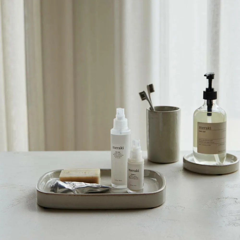 Saml dine tvålar, lotions og andre prylar på denne tidløse og minimalistiske bricka fra Meraki. Fatet er lavet af lergodslera med grå glasyr og smälter fint ind i den lugna og naturliga känslan i hemmet, oavsett om du använder det i köket eller i badrummet. Eller hvorfor ikke i begge? Skaffa två. En lille detalje, som rækker langt. Forvara allt från flaskor och svampar till krämer och smycken på brickan när du vill ha nödvändiga vardagsprylar nära till hands.