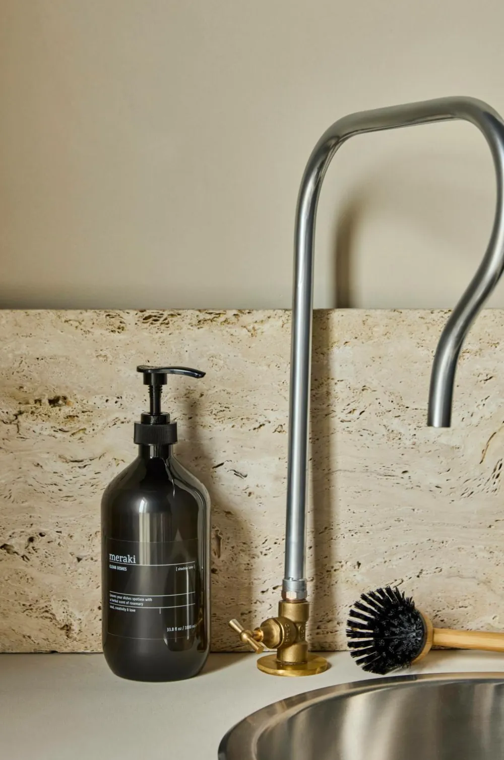 Nyd dine køkkenritualer med et smukt og enkelt opvaskemiddel i en grå flaske med en sort pumpe og en gennemsigtig etiket. Lad urteduften løfte dit humør og gøre opvasken til et diskret forfriskende øjeblik. Stil den ved vasken som et dekorativt indslag i køkkenet eller bryggerset, hvor form og funktion mødes, og stilen kommer naturligt.