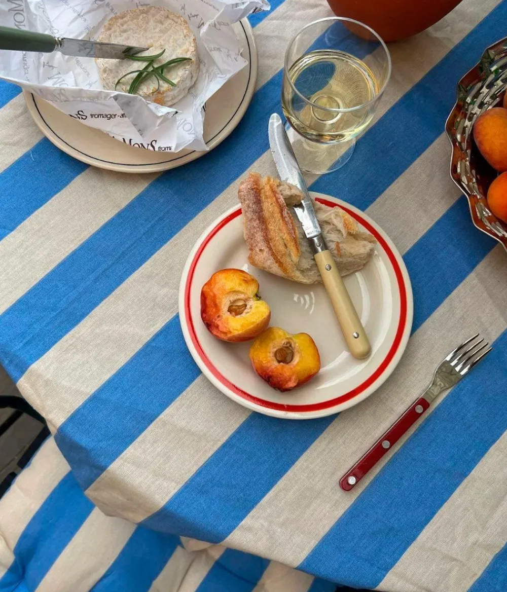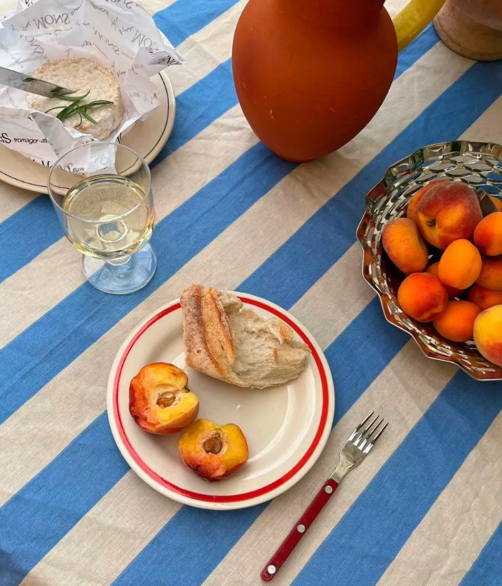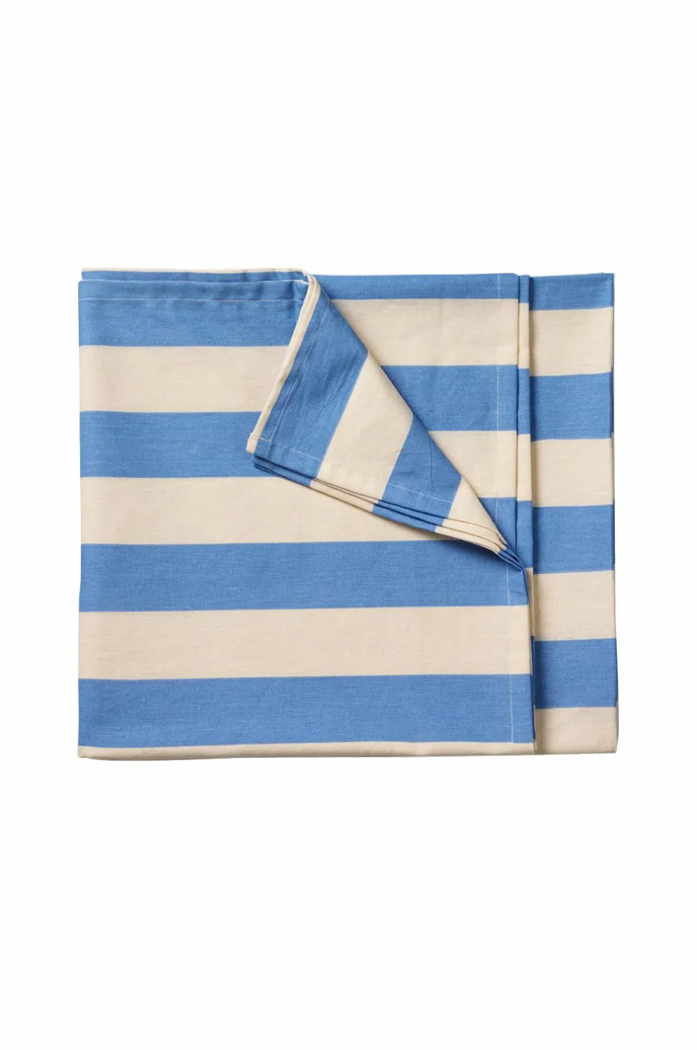 Franka fra det svenske mærke Midnatt er et stribet mønster i blød abrikos og blå. Franka dugen fås i fire størrelser. Dugen er GOTS-certificeret og fremstillet af 100 % økologisk bomuld.