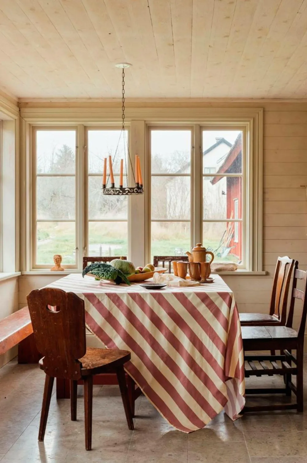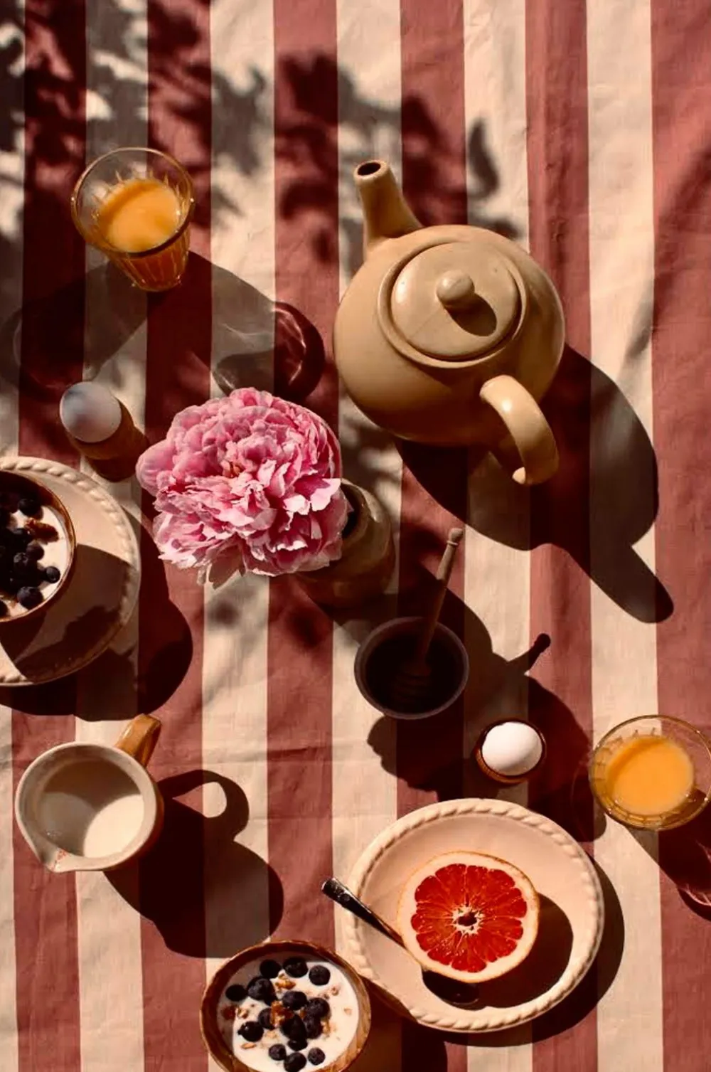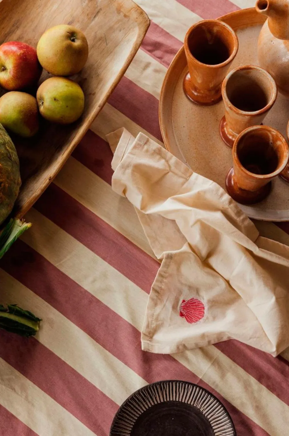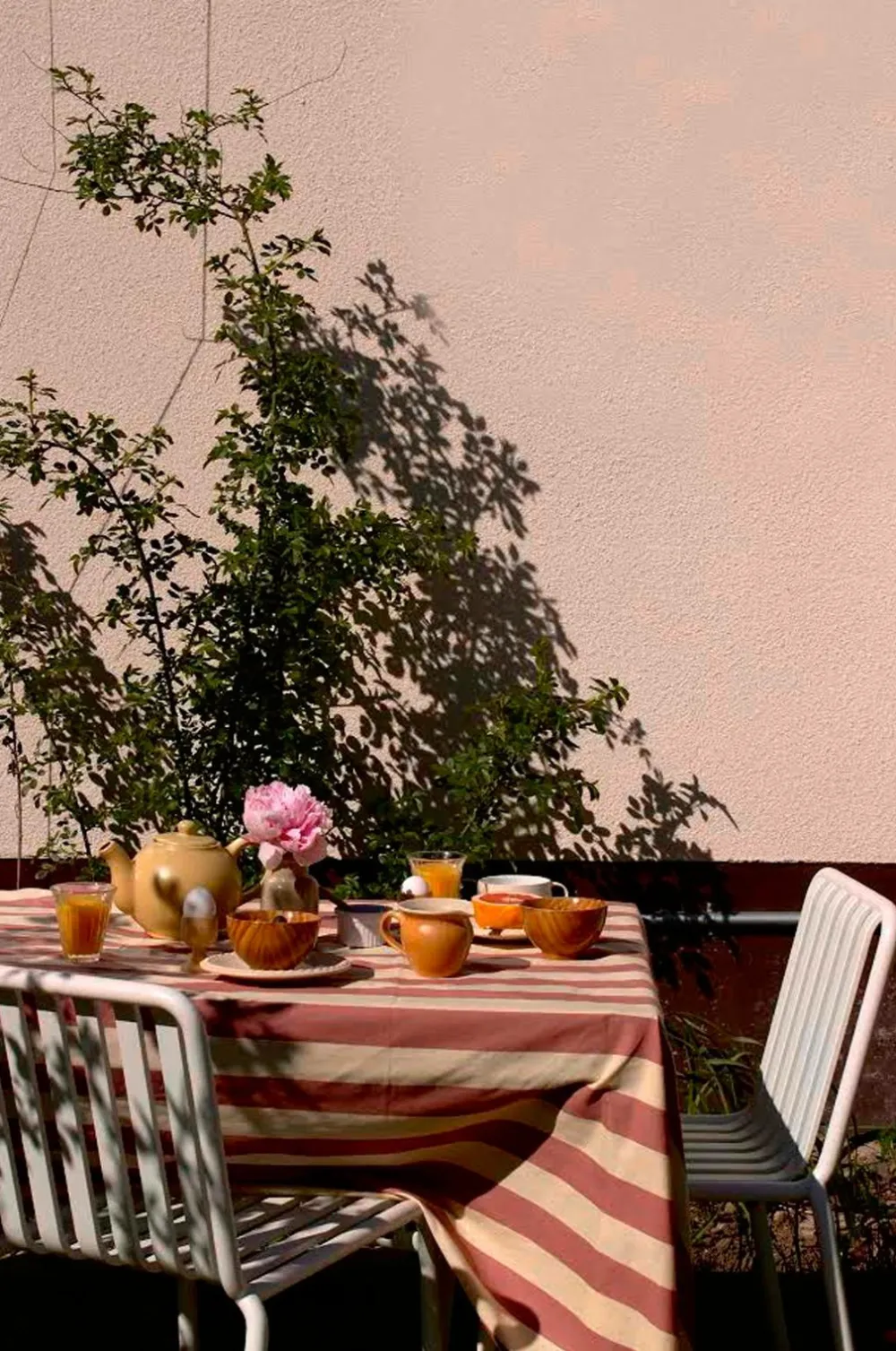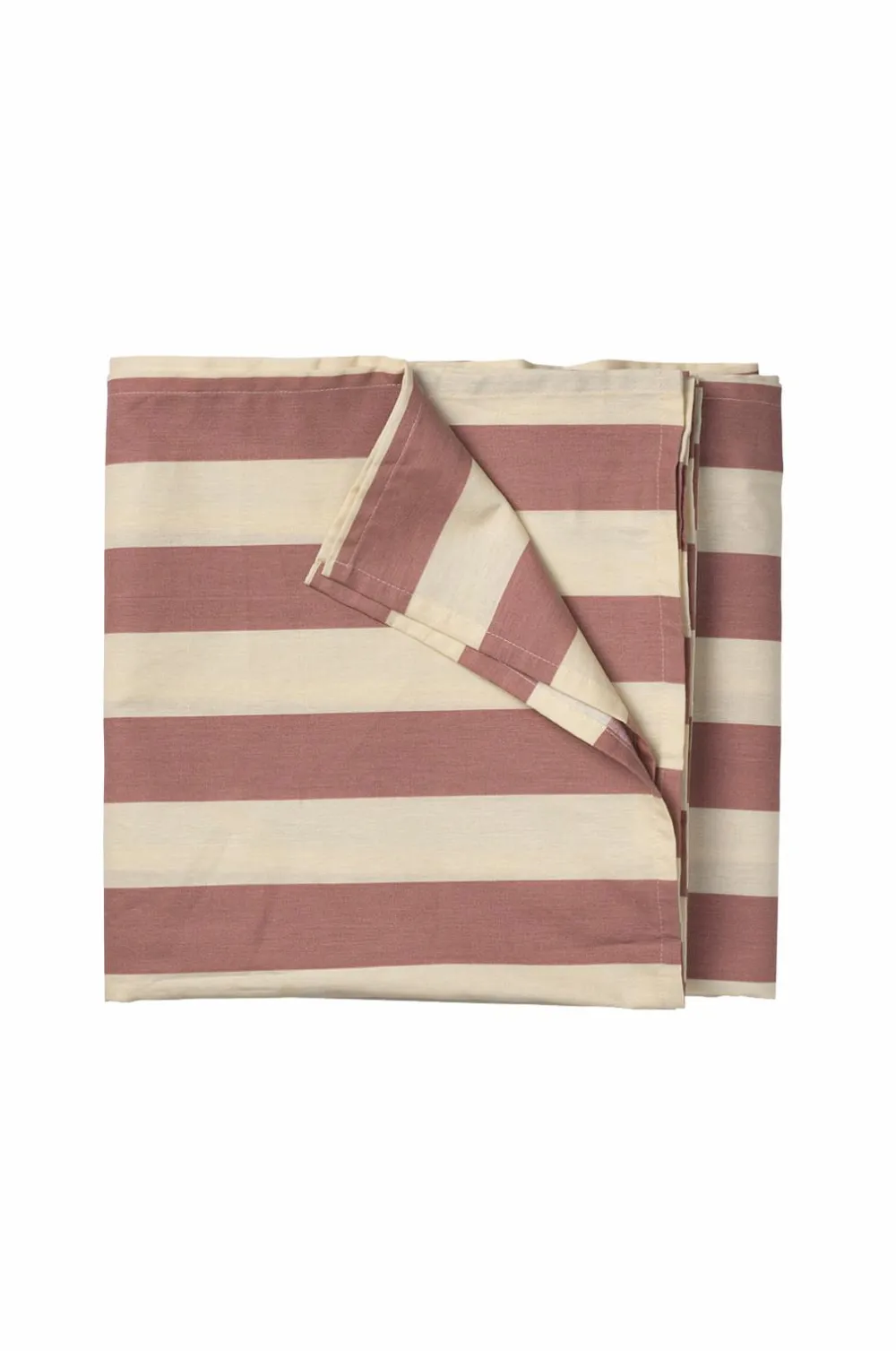Irene-dugen fra Midnatt har et stribet mønster i blød gul og terracotta. Dette er et GOTS-certificeret produkt fremstillet af 100 procent GOTS-certificeret økologisk bomuld. Vaskes ved maks. 60 grader.