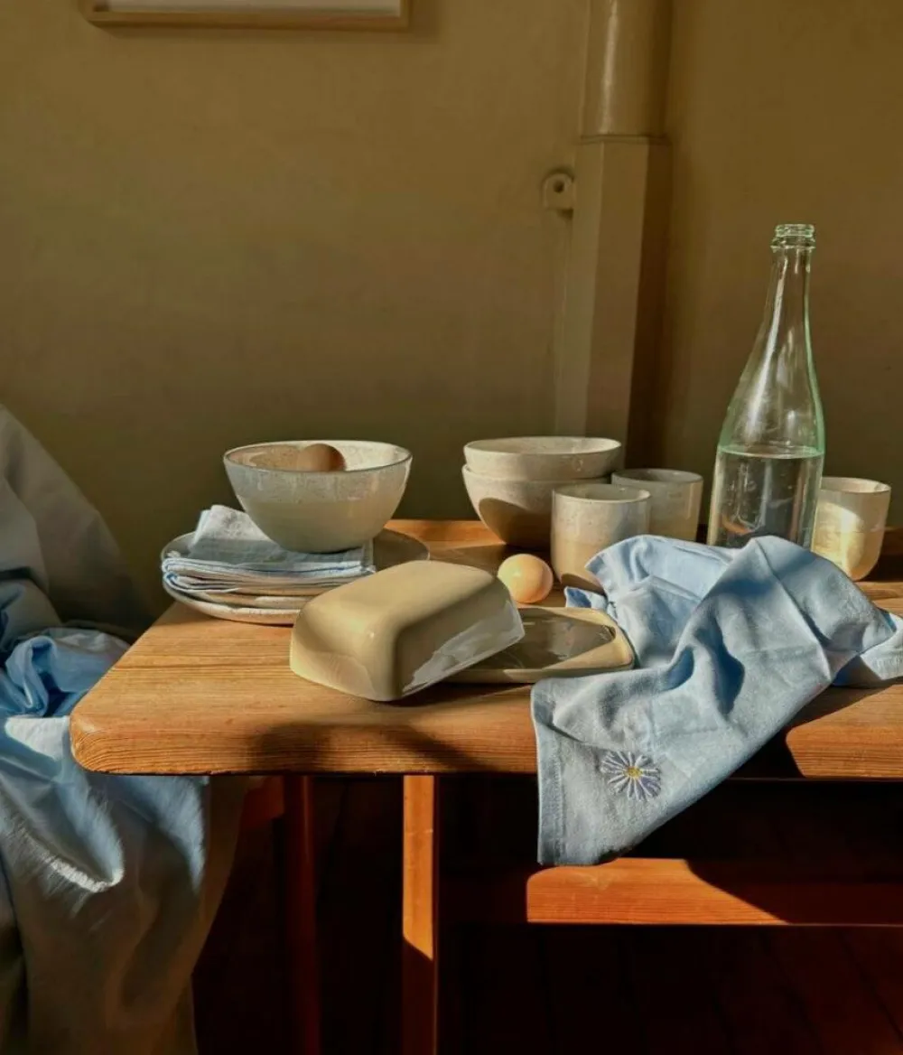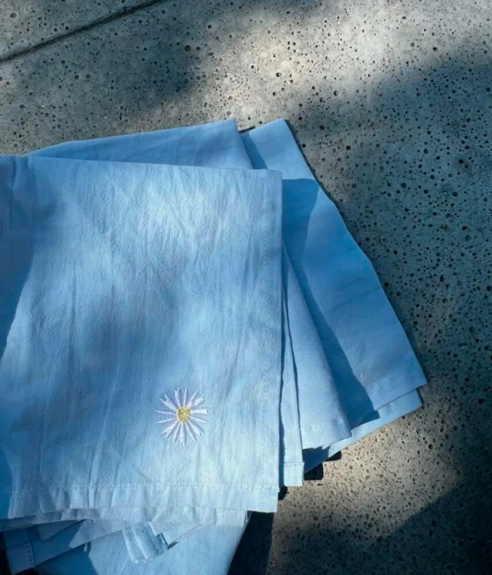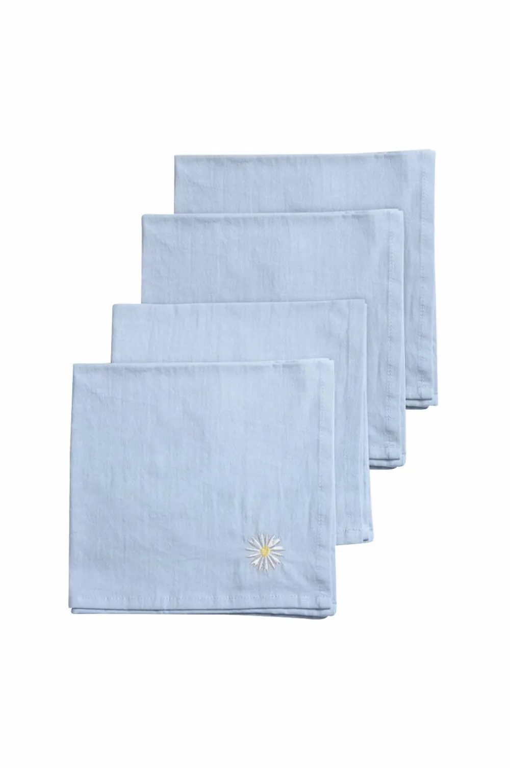 Disse servietter kommer i et sæt med fire. Hver serviet har et hvidt daisy broderet på sig. Stoffets farve er lyseblå, og størrelsen er 40×40 cm. Servietterne er GOTS-certificerede og fremstillet af 100 % økologisk bomuld.