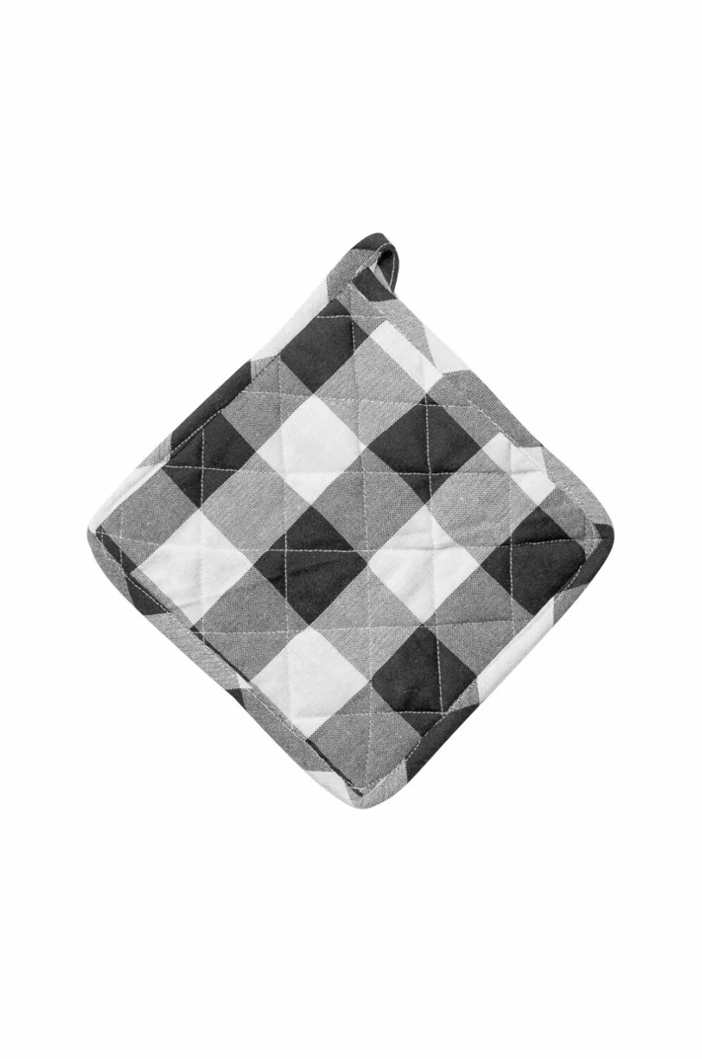 Grydelapper i genbrugsbomuld. Det mønstrede stof gingham er lavet af genanvendt bomuldsgarn, der er fremstillet af affaldsprodukter fra den indiske tekstilindustri.