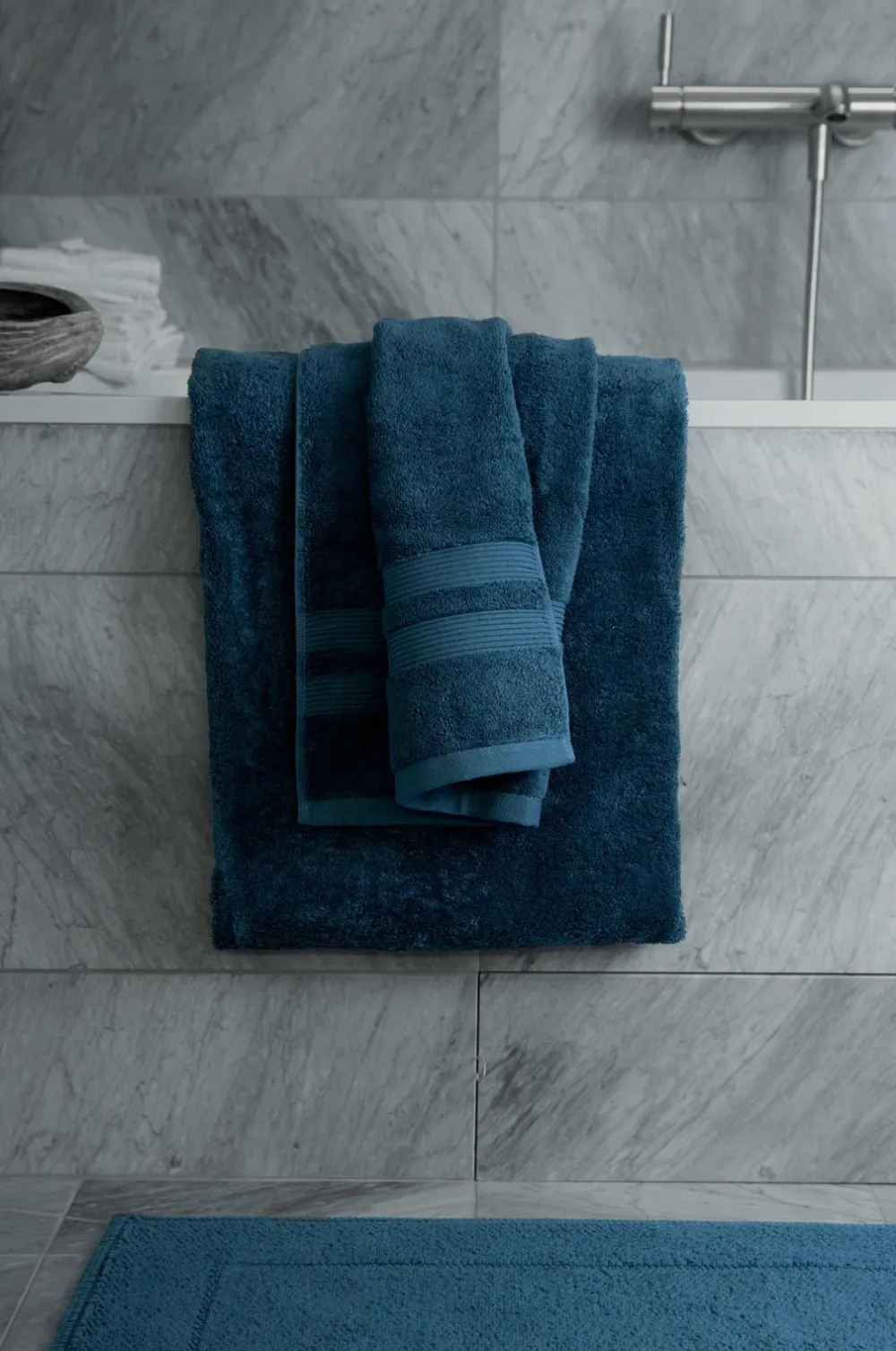 Badeværelsesmåtte i stonewashed bomuldsfrotté med indvævet bort i en ramme. Oeko-Tex Standard 100