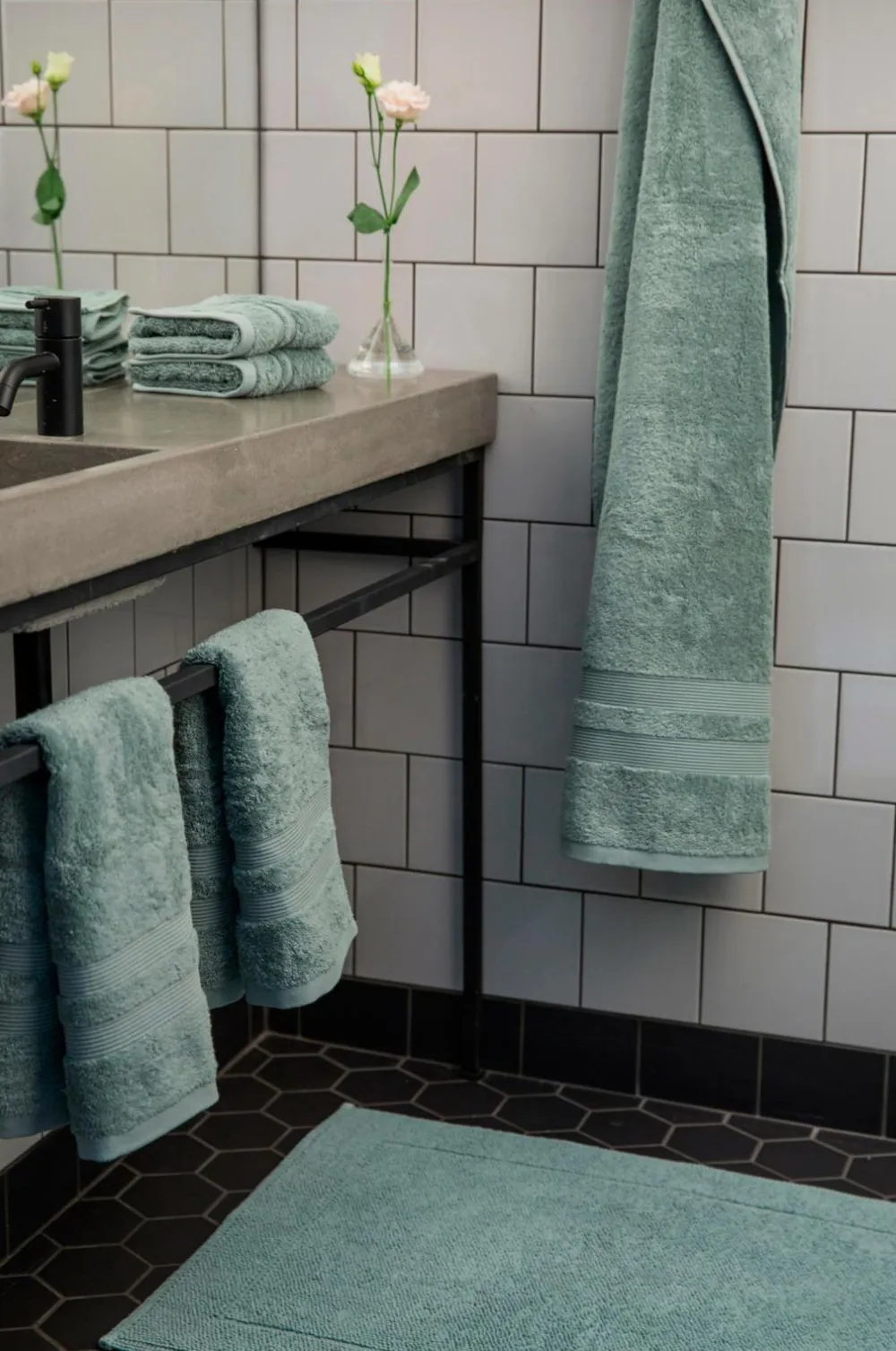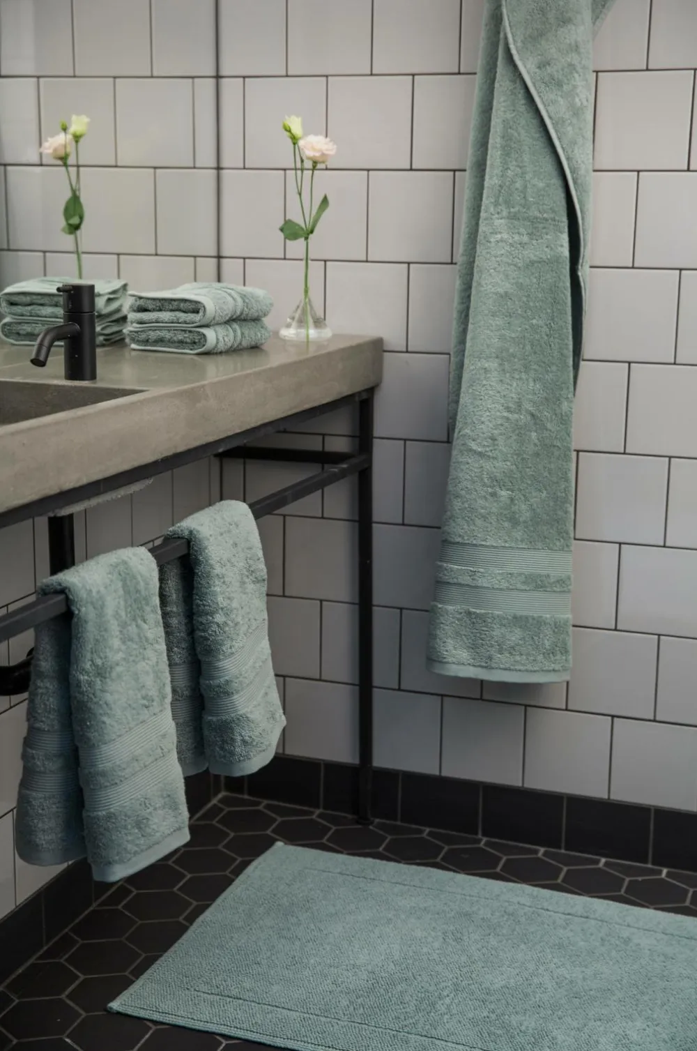 Badeværelsesmåtte i stonewashed bomuldsfrotté med indvævet bort i en ramme. Oeko-Tex Standard 100