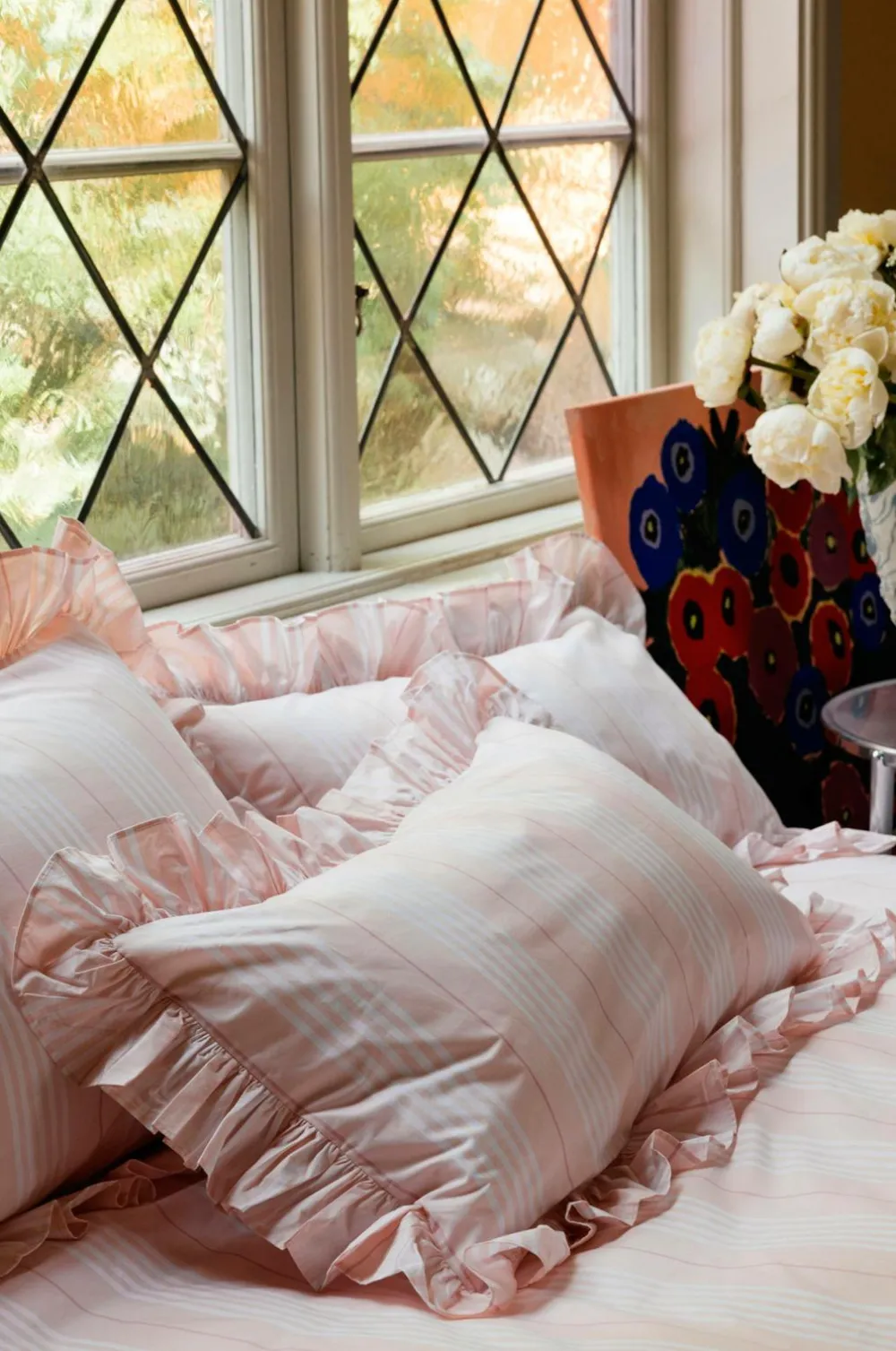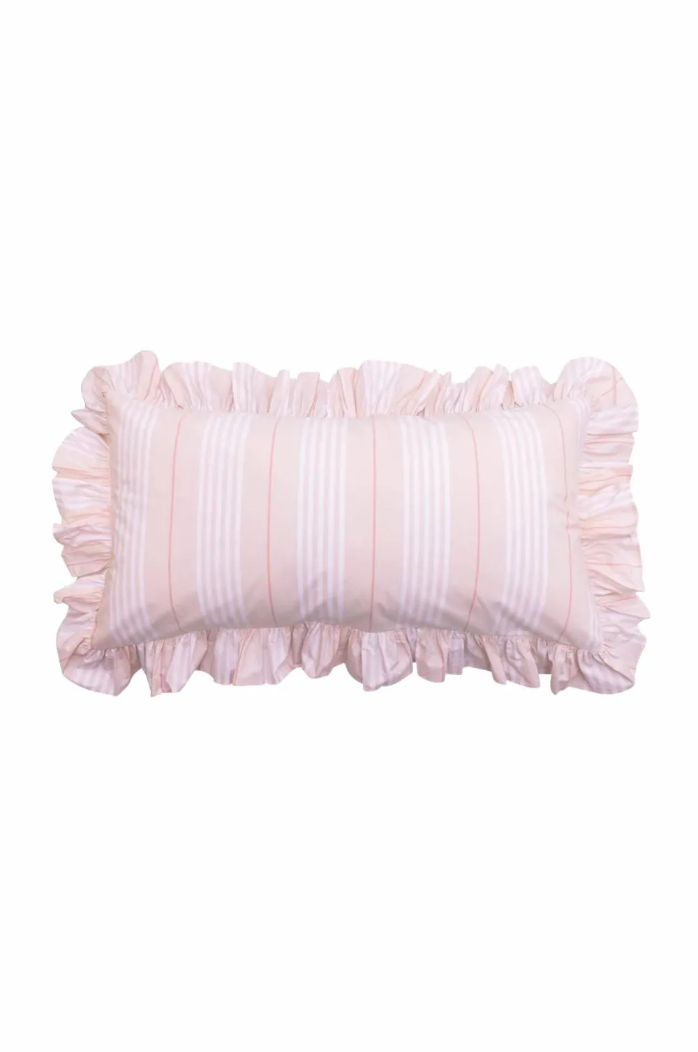 Pudebetræk af kæmmet bomuldspercale. Trådantal 300. Vævet i et tidløst stribet design og afsluttet med en legende 8 cm flæsevinge. Overlappende lukning.