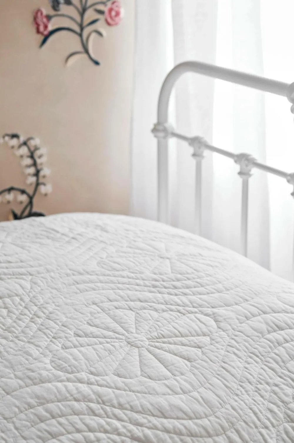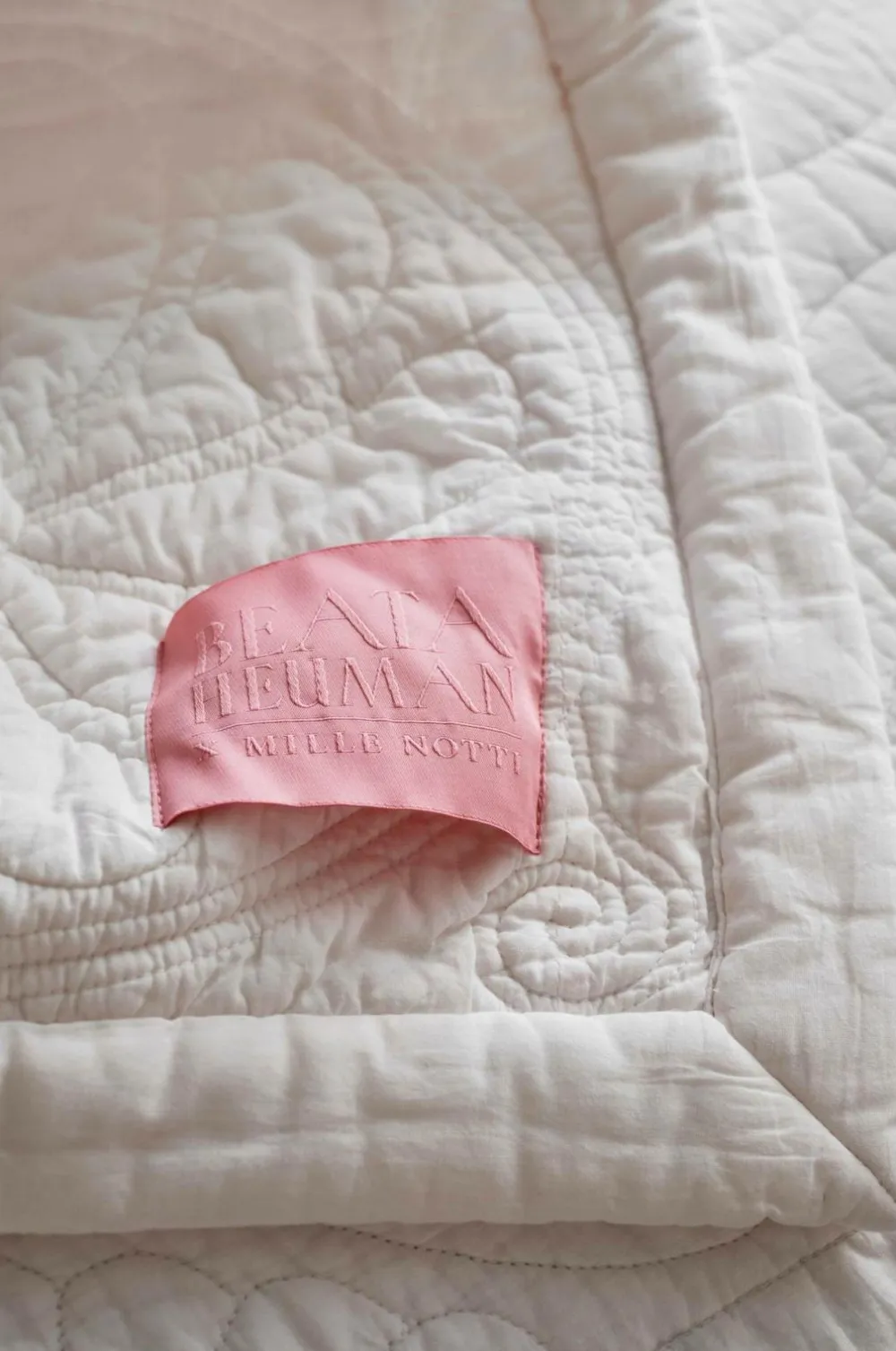 Quiltet sengetæppe i et mønster designet af Beata Heuman. Vendbart design med kontrastfarver (blå og lyseblå) på for- og bagside. Betrækket er lavet af bomuldsvoile, som giver sengetæppet en blød og delikat struktur. Fyldt med bomuldsvat. Afsluttet med sømmede kanter.
