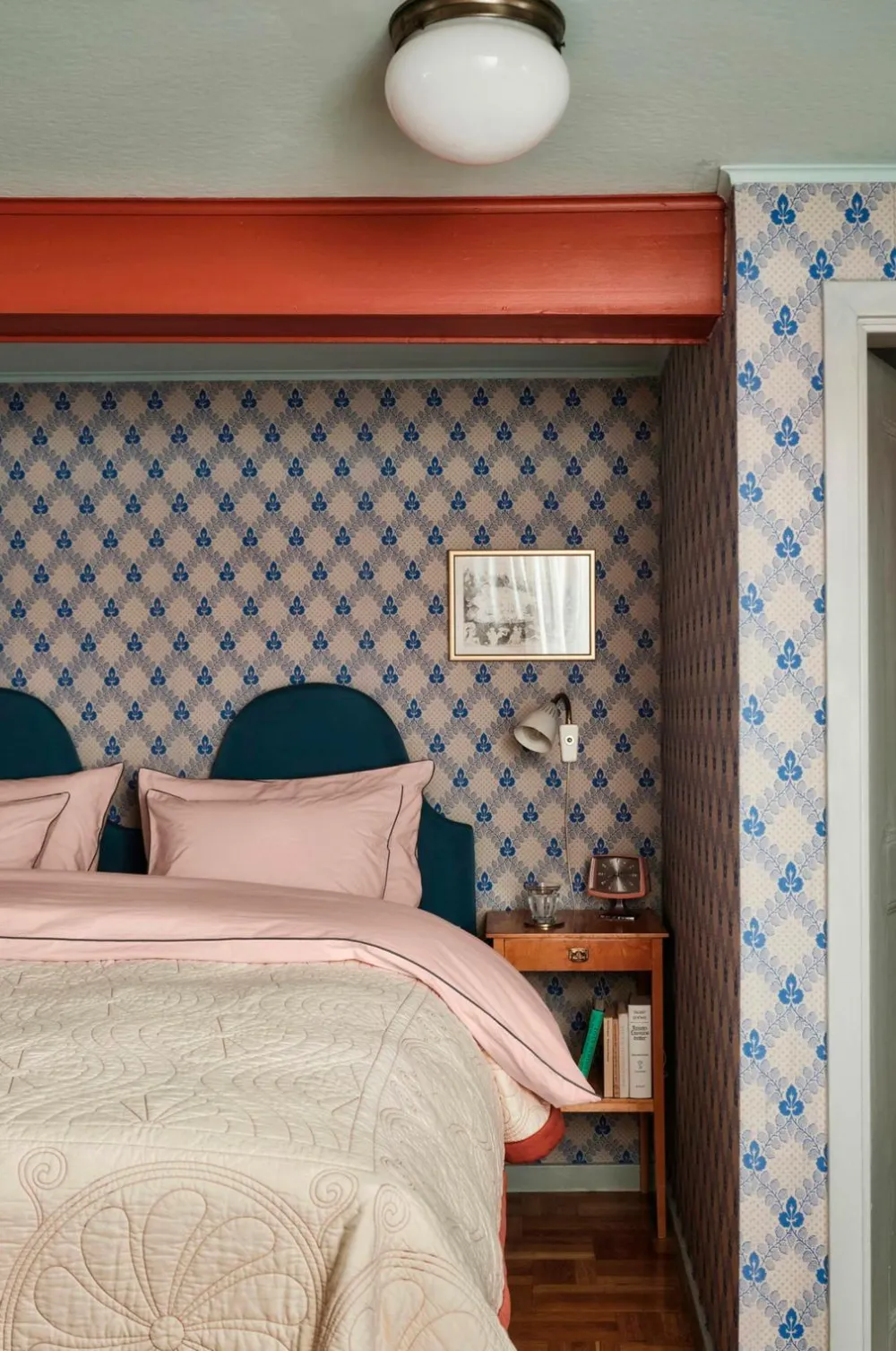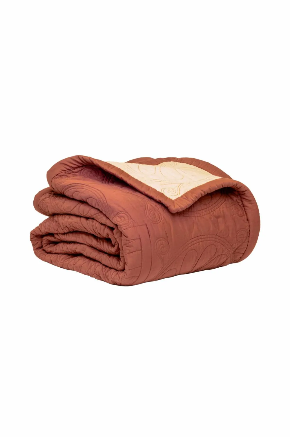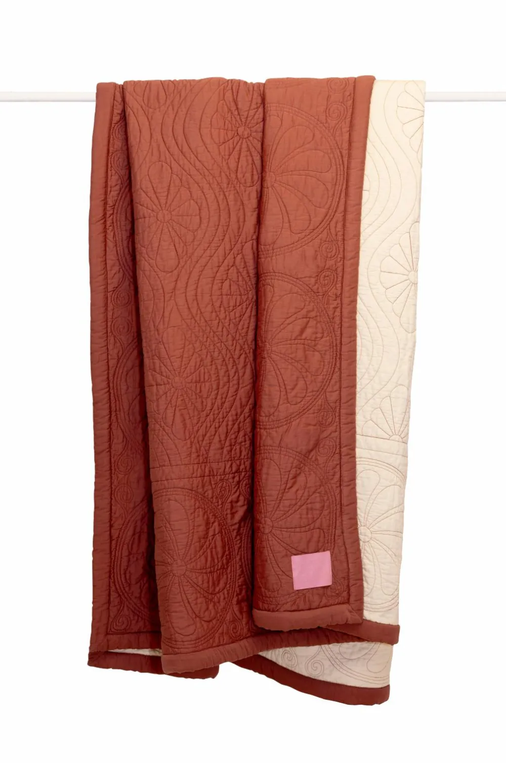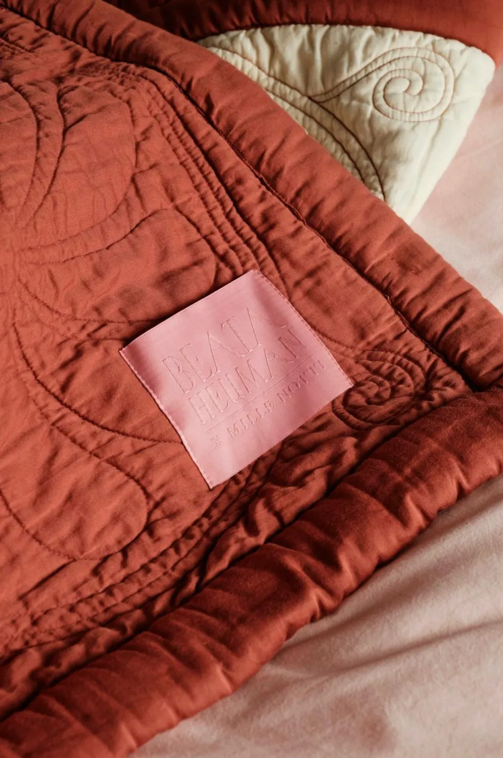 Quiltet sengetæppe i et mønster designet af Beata Heuman. Vendbart design med kontrastfarver (blå og lyseblå) på for- og bagside. Betrækket er lavet af bomuldsvoile, som giver sengetæppet en blød og delikat struktur. Fyldt med bomuldsvat. Afsluttet med sømmede kanter.
