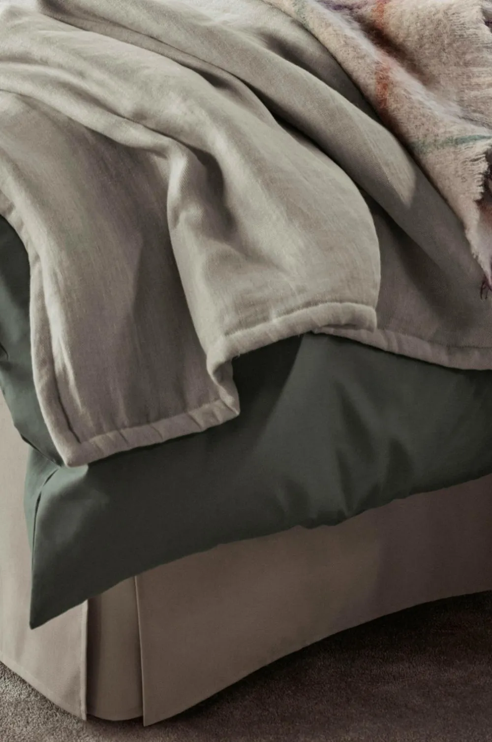 Hotel-sengetæppe lavet af 100% fleksibelt linned. En smuk struktur, der giver rummet et afslappet præg og en kontinental følelse. Let quiltet og syet med en dekorativ kant langs kanterne. Fyld af polyester. Tørret i tørretumbler for en ekstra blød fornemmelse. En lille plaid (130×200) til fodenden af din seng.