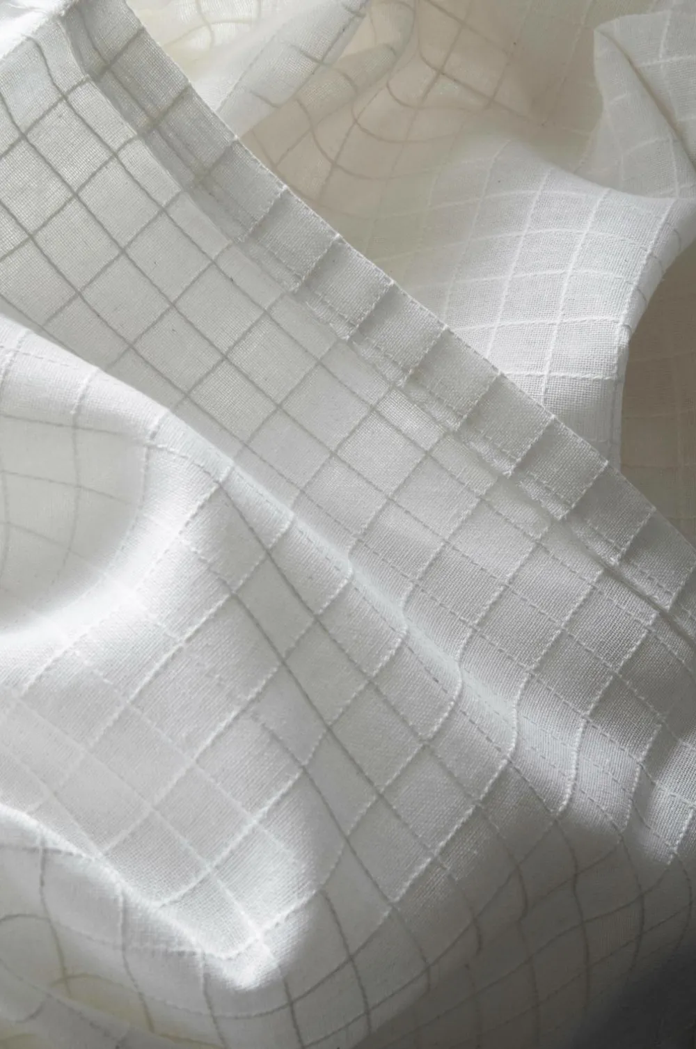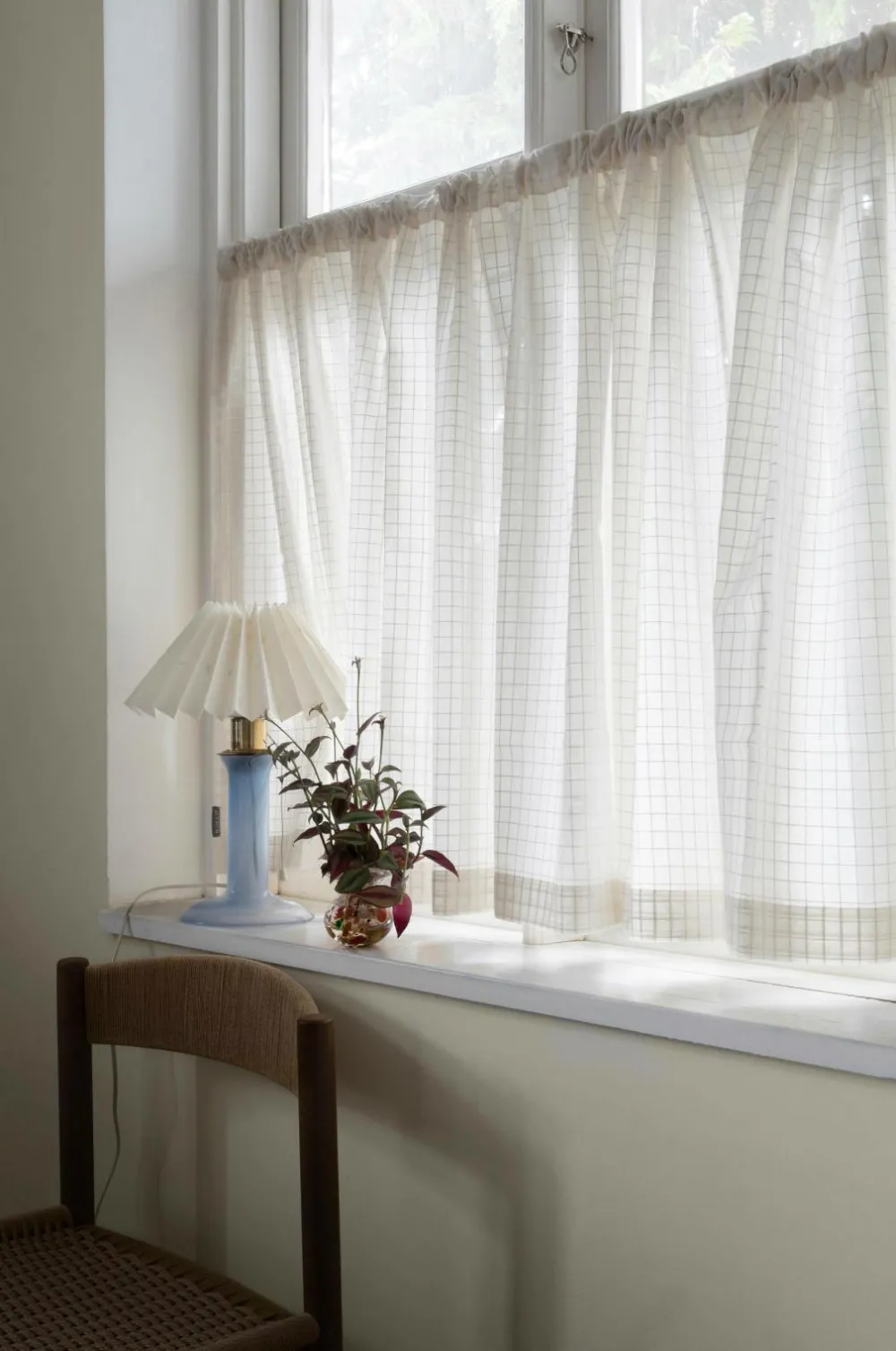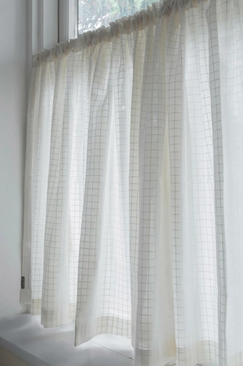 Cafégardin som er fremstillet af ternet stof i genindvundet bomuld og polyester. Gardinet er syet med en kanal, der passer til en tynd gardinstang eller gardinspiral og har et lille rynkehoved i toppen. Gardinet har et skræddersyet look med klassiske, usynlige sidesømme og dobbelt oplæg forneden, så det får den rigtige tyngde. Sømmen forneden har desuden en åbning i hver side, så gardinet også kan bruges som spændegardin i vinduer, på døre eller skabe. Stoffet er OEKO-TEX® Standard 100 certificeret, det vil sige at produktet er testet for at sikre, at det ikke indeholder sundhedsskadelige stoffer. 30 grader skånsom maskinvask eller kemisk rens. Sælges stykvis.