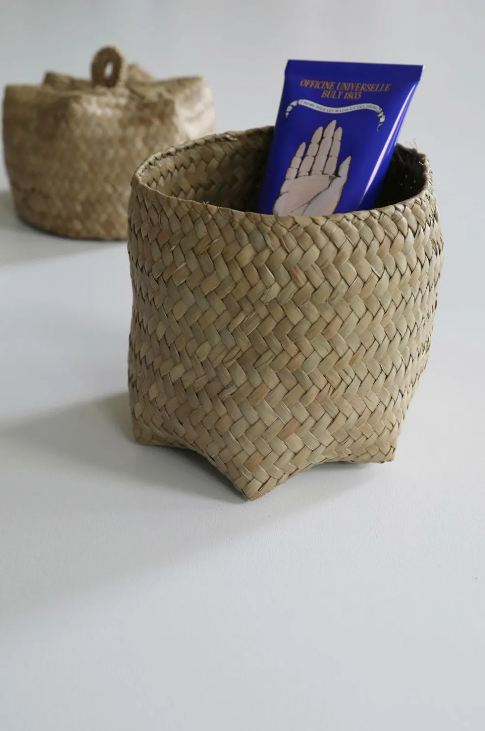 Beholder med låg som er fremstillet af søgræs. Diameter 12 cm, højde 13 cm