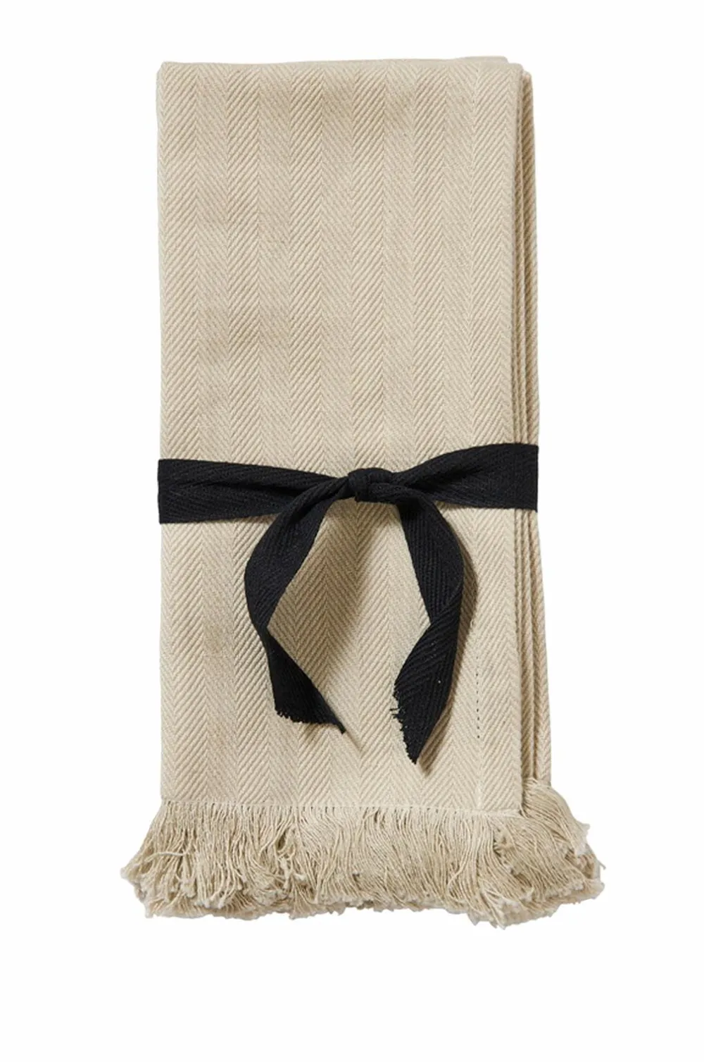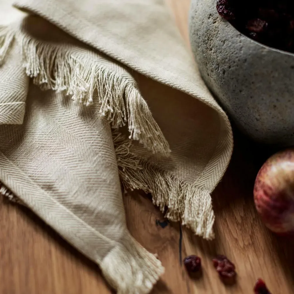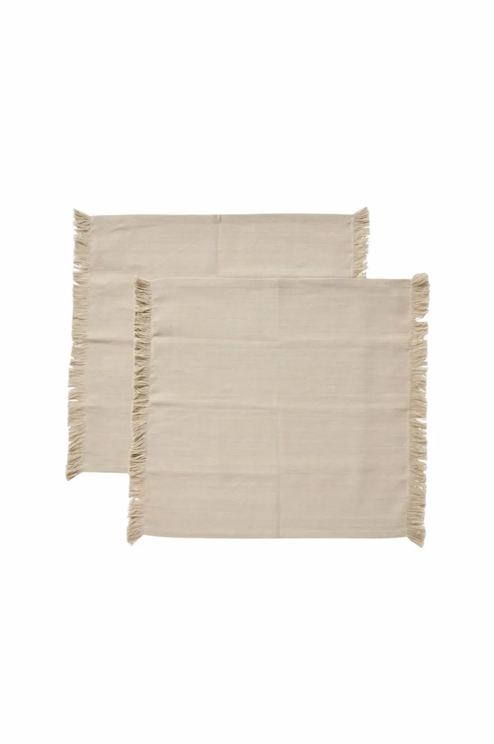 De dekorative frynser på to sider giver servietten et enkelt, uformelt og håndlavet look. Servietten er et perfekt supplement til en personlig og naturinspireret borddækning og tilbyder både en praktisk og æstetisk løsning. Brug servietten sammen med Umami-dækkeservietten, så den enten matcher eller skaber kontrast i din borddækning. Servietterne sælges i sæt med 2. Plejeanvisning: Servietten kan maskinvaskes ved 60 grader. Størrelse: 45×45 cm. Materiale: 50% bomuld / 50% hør. Design: Kira Usbeck.