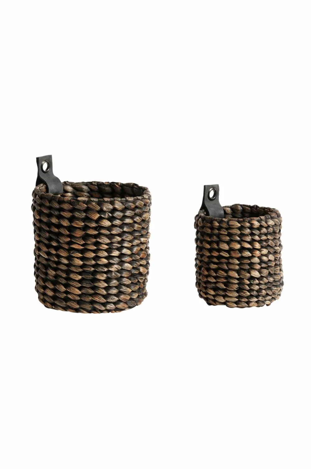 Sæt med to naturfarvede minikurve af vandhyacint fra Muubs. Kurvene er håndflettede af lokale kurvemagere i Indonesien. De er designet med et lille læderbånd, hvilket gør det muligt at hænge dem i f.eks. en lille krog. Man kan hænge dem på et stativ som opbevaring. Kroge medfølger ikke.