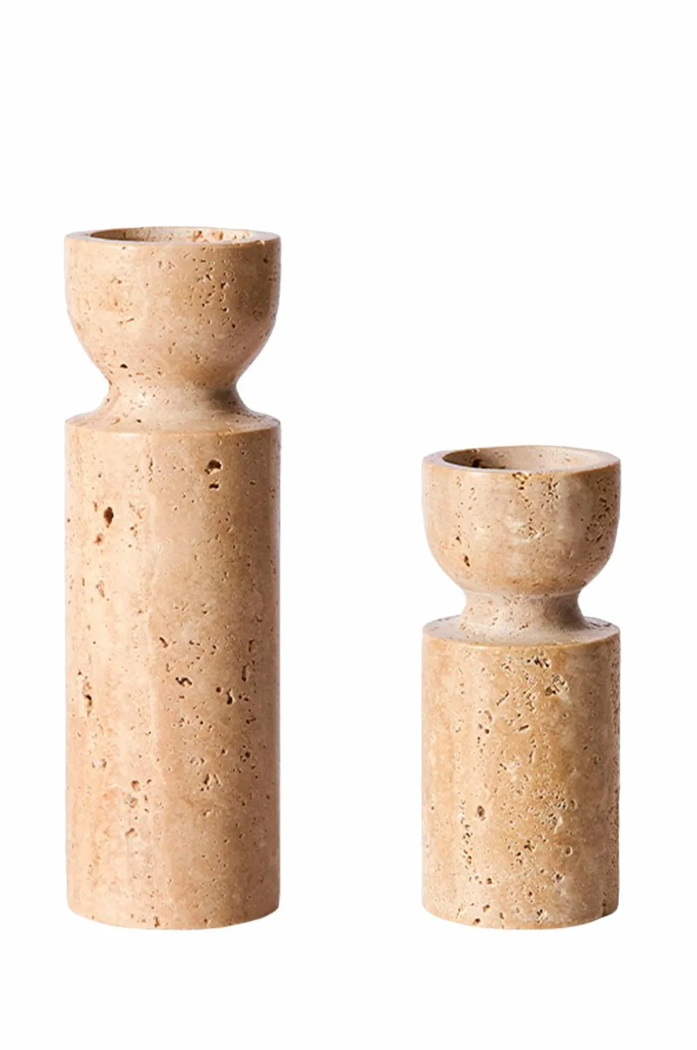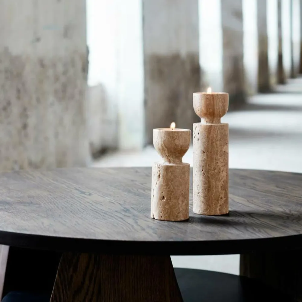 De smukke Minerva fyrfadsstager er opkaldt efter gudinden Minerva i den romerske mytologi, som symboliserer visdom, men også støtter kunst, handel og håndværk. De smukke fyrfadsstager er lavet af naturlig travertin, som er en kalksten. Den smukke travertin har et unikt farvespil, som er skabt af aflejringer af kalkholdigt vand i bjergene. Overfladen på fyrfadsstagerne er glat, men kan også have små unikke træk og fordybninger, der omfavner og hylder stenens naturlighed.