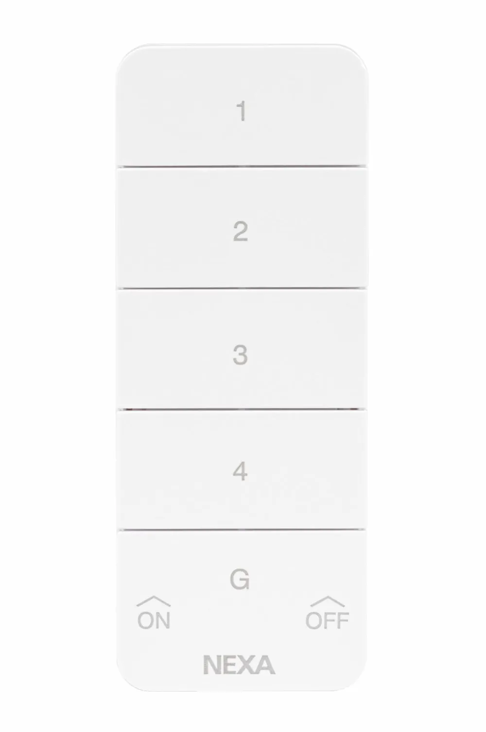 Nexa MYCT-2107-fjernbetjeningen med magnetisk montering styrer alle selvlærende modtagere i System Nexa, både plug-in og indbyggede. Den har fire kanaler og en gruppekanal med On/Off-funktion og pushdim. Leveres med et magnetisk vægbeslag.