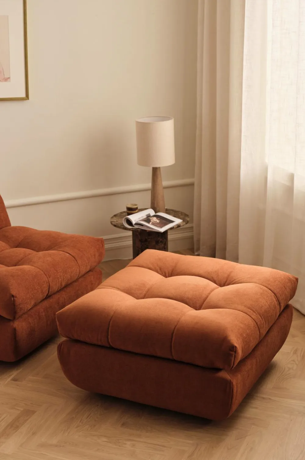 Denne puf er en perfekt balance mellem form og funktion. Kombinerer god komfort med et elegant look. Rammen er med nozag-fjedre. • Skelet i Bøg • Ben i egetræ • Fyld i polyetherskum