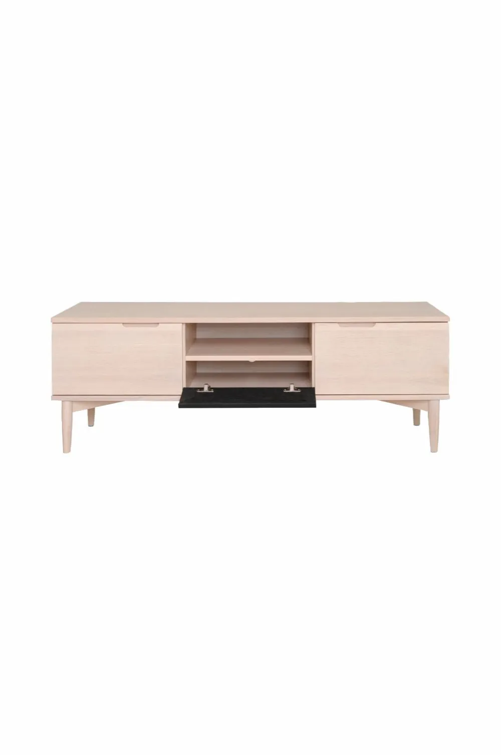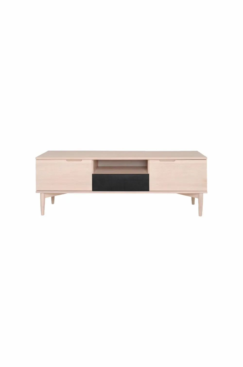 Moderne mediebænk i lakeret eg. 2 opbevaringsskabe, 1 hylde og 1 opbevaring med nedfældelig luge.