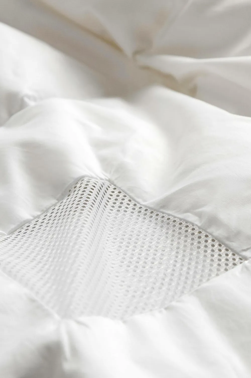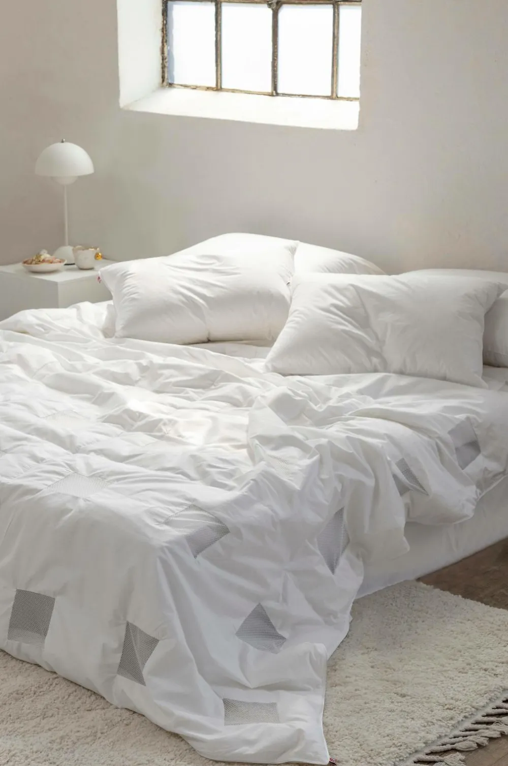 Når nætterne bliver varme… føles denne dyne som en kølig brise mod din hud. Perfekt til dem, der let bliver varme, men stadig længes efter følelsen af luksus og blød komfort. Fyldt med europæisk gåsedun, tilbyder den fjerlet komfort og enestående åndbarhed, mens luftige meshpaneler giver ekstra ventilation, så du kan holde dig behageligt kølig hele natten – som at sove under et blidt sommerkys. Dyne er fyldt med 100 % europæisk gåsedun, der er kendt for sine ekstra store klynger, der giver lav vægt, luftighed og fremragende temperaturregulering. Meshpaneler i firkanterne sikrer effektiv luftcirkulation og hurtig fugttransport, så dynen forbliver tør og kølig selv på varme nætter. Betrækket er en tæt vævet blanding, der giver en eksklusiv glans og en silkeagtig blød fornemmelse mod huden, samtidig med at det understøtter naturlig åndbarhed. Fyldkraft: 825 Cuin.