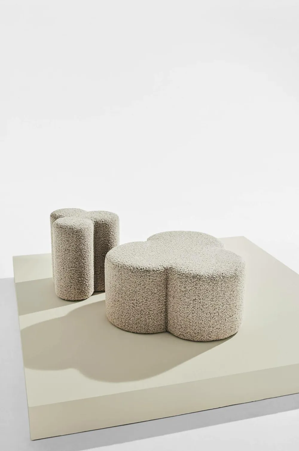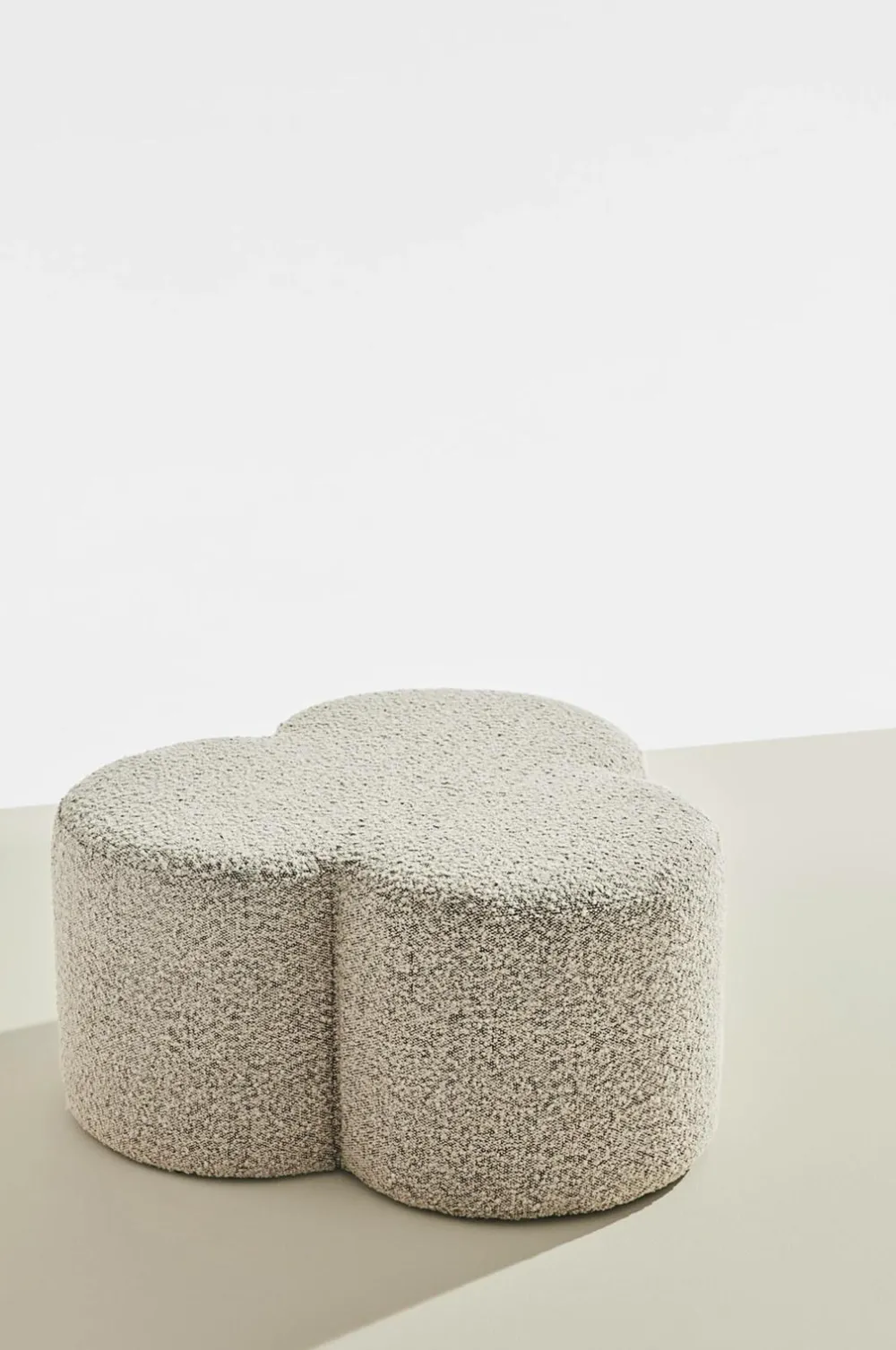 Puffen er formet som en trekløver og er velegnet som puf, fodskammel eller bord med en lille bakke på. Puffen er beklædt med blød bouclé. Garnet som stoffet er vævet af har små løkker og knuder som skaber et blødt stof med let krøllet overflade. Stoffet er meget slidstærkt med Martindale på 79000. Rammen er af FSC-certificeret fyrretræ og plywood som er beklædt med behagelig og fast polstring.