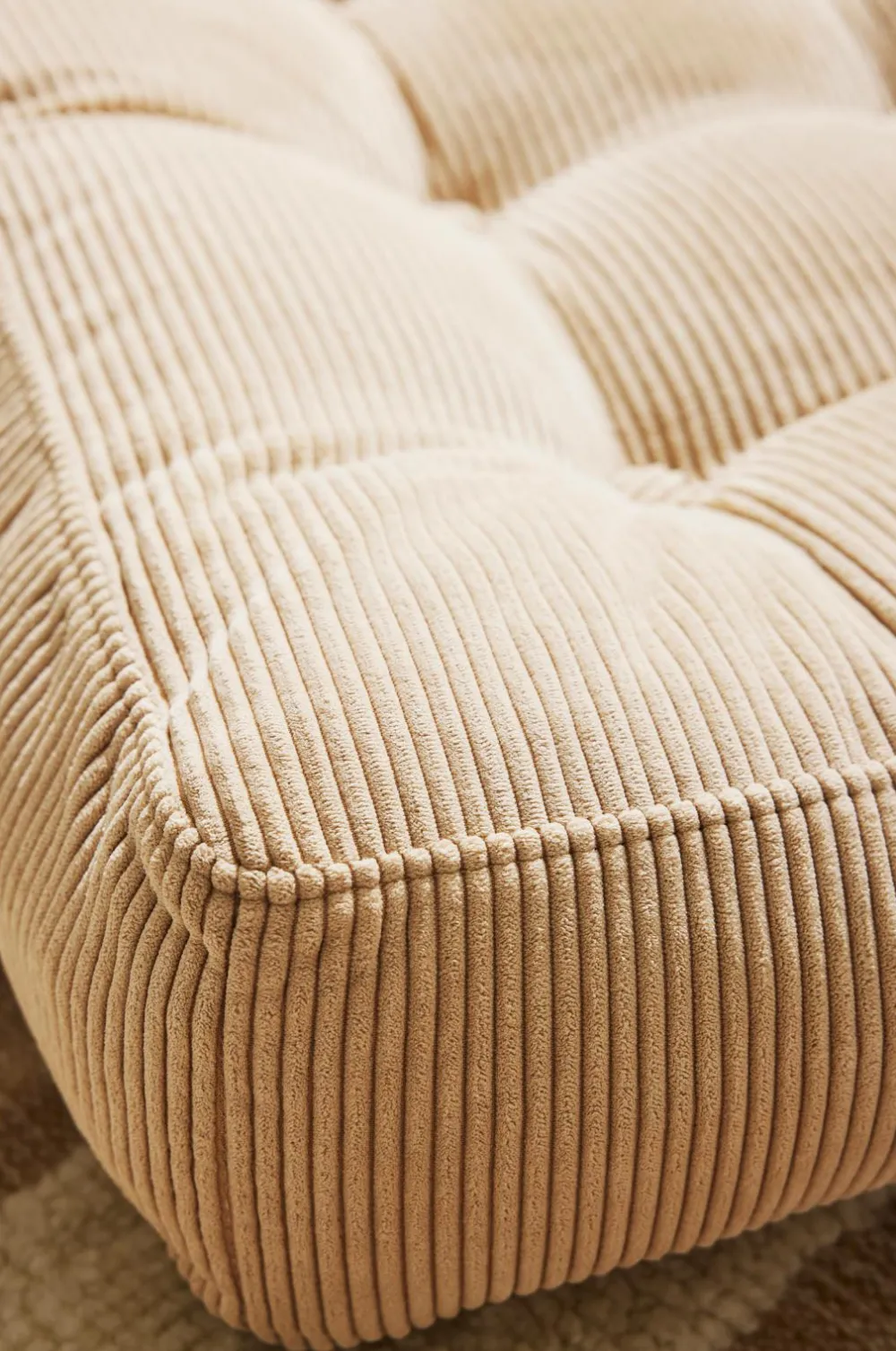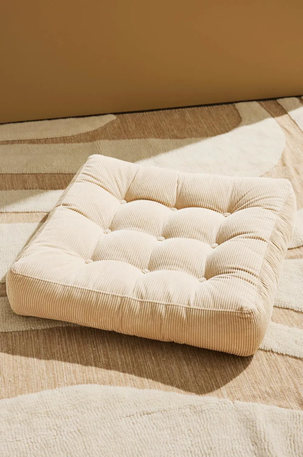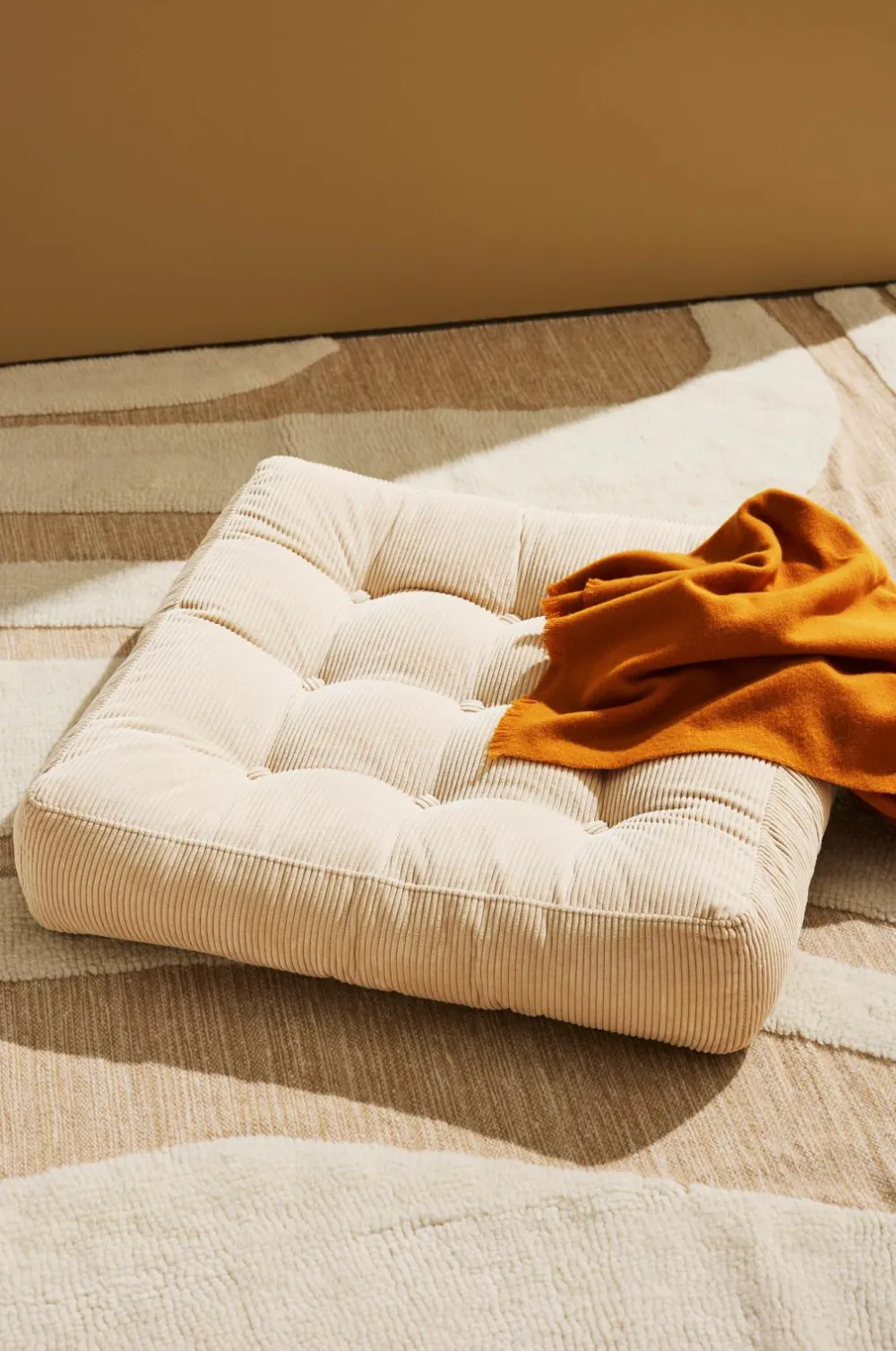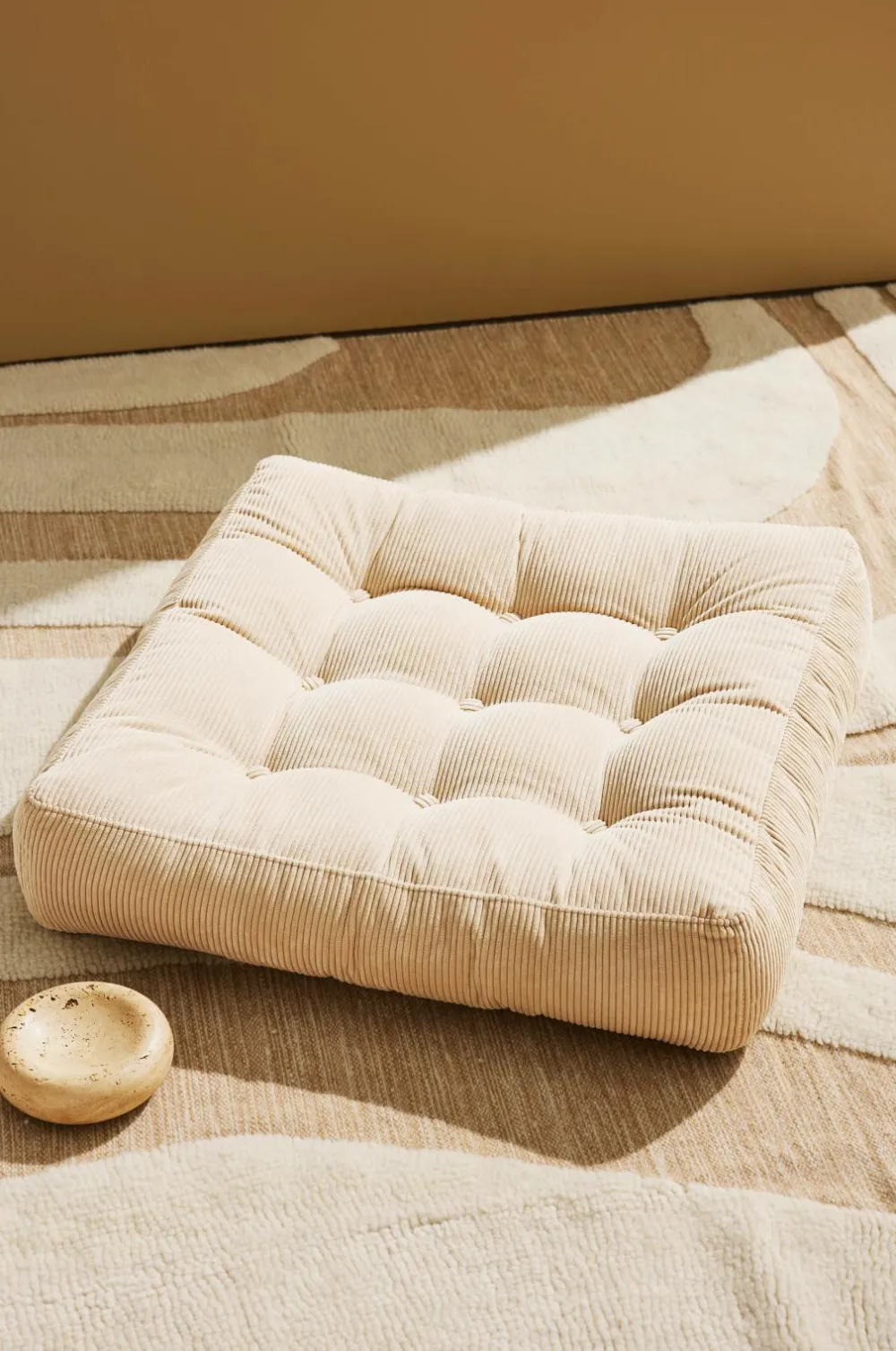 En gulvpude i blødt fløjlsstof. Den er designet med 9 dybt tuftede, polstrede knapper og har en diskret lynlås nær gulvet.
