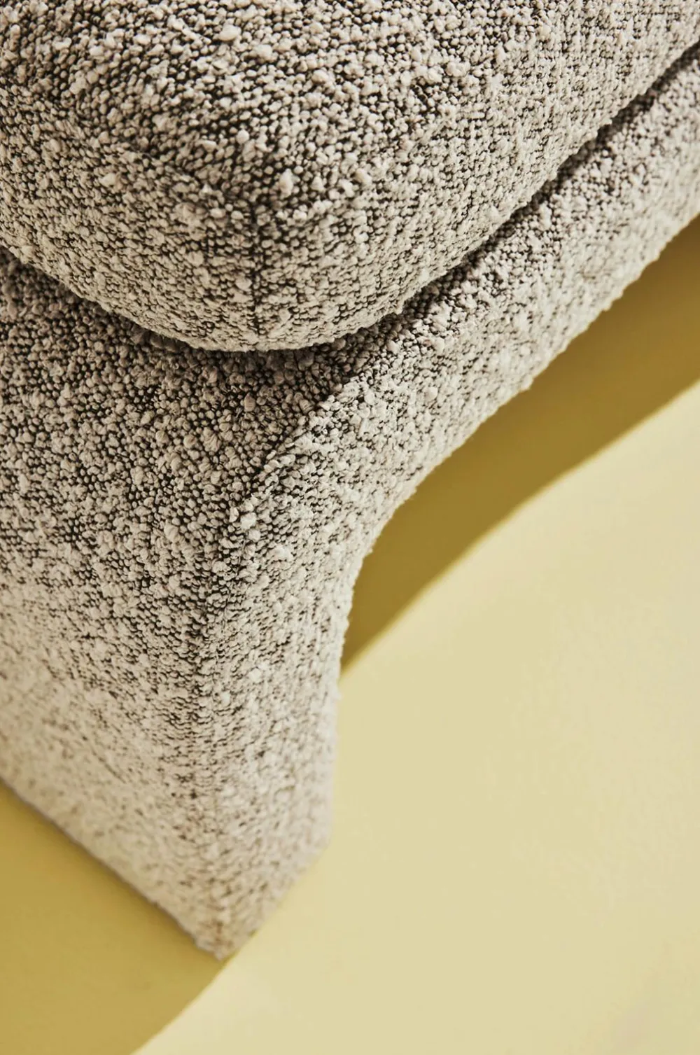 Sofistikeret, speciel i sin fremtoning og det bølgende design. Mika er en luksuriøs puf beklædt med blød bouclé. Garnet som stoffet er vævet af har små løkker og knuder som skaber et blødt stof med let krøllet overflade.