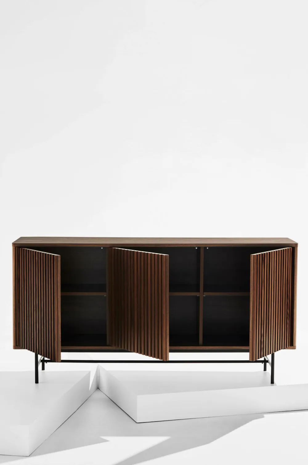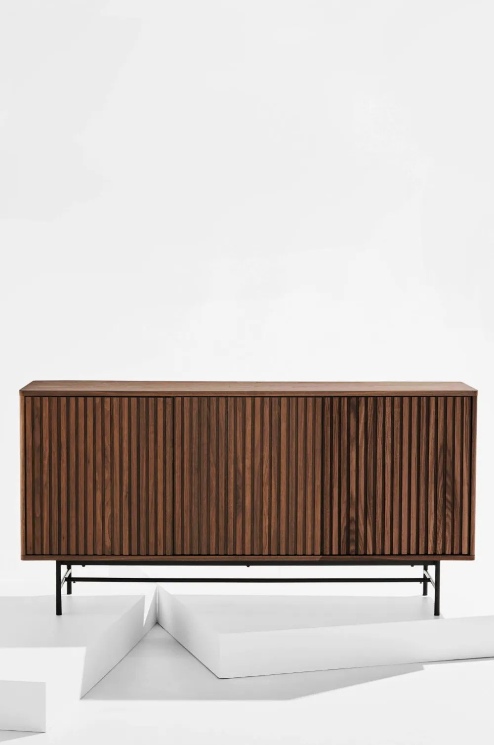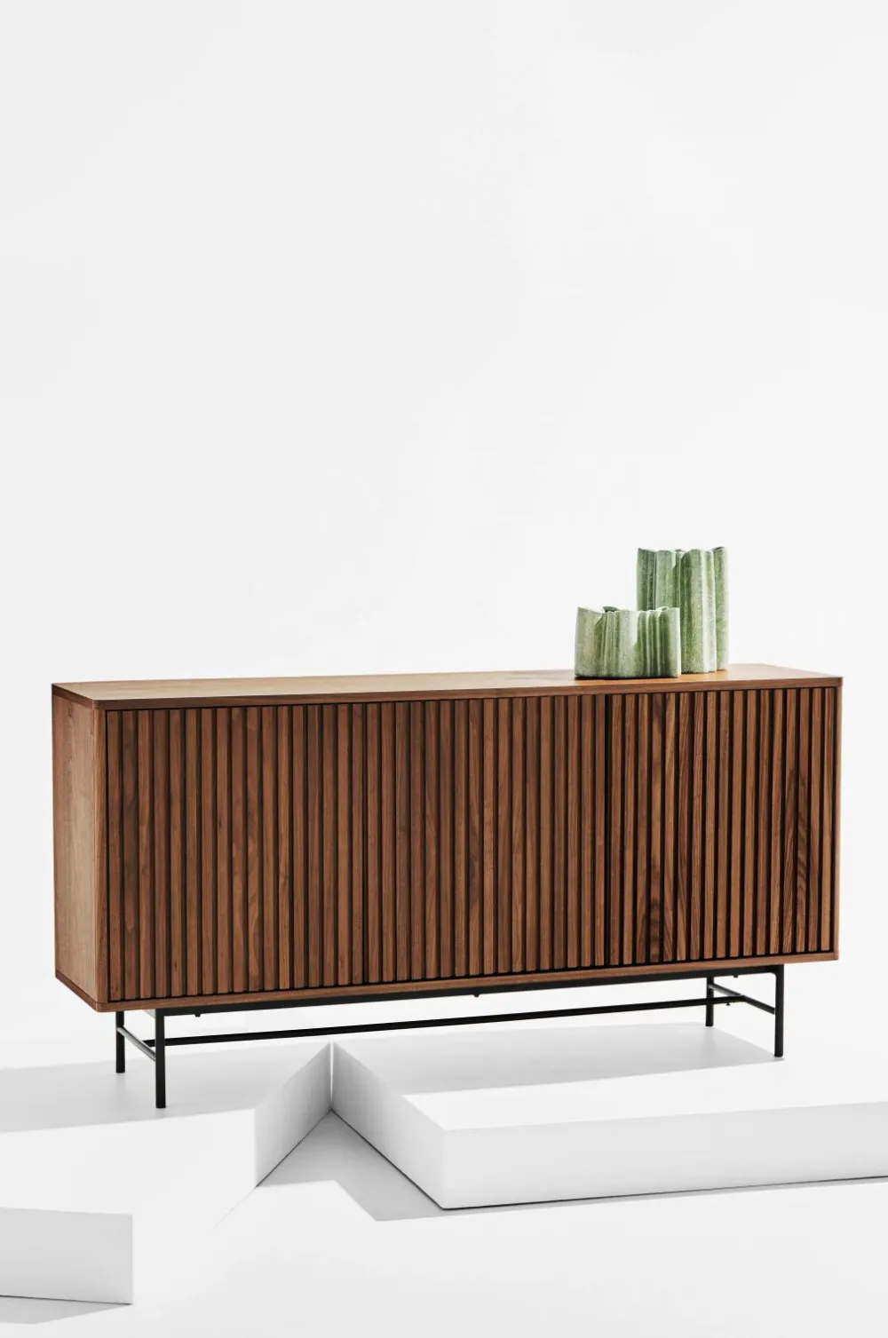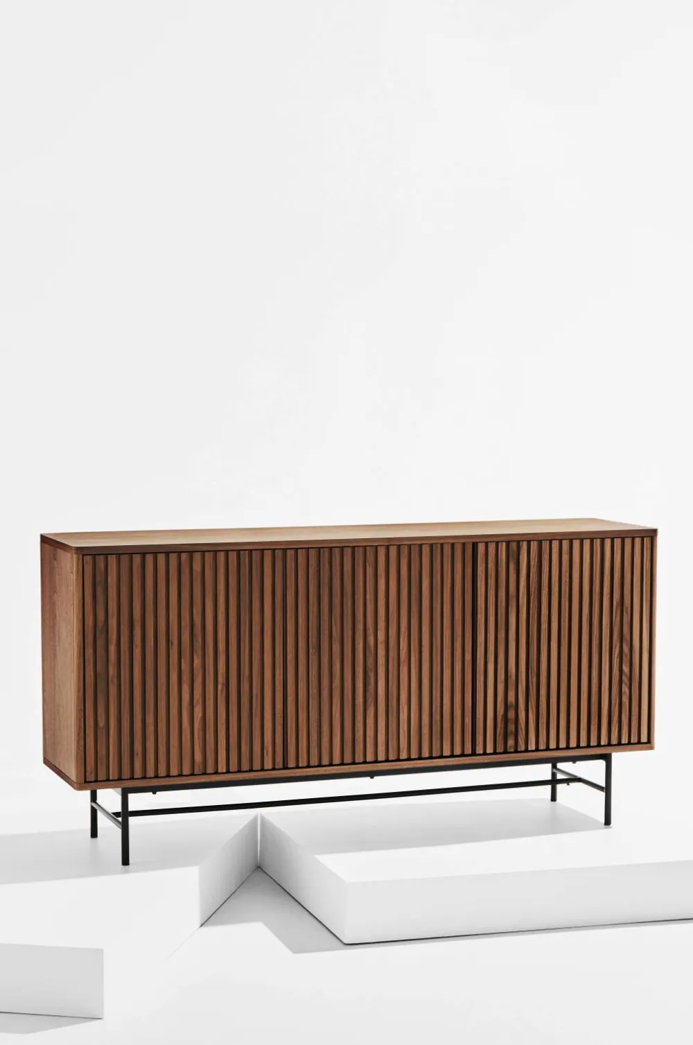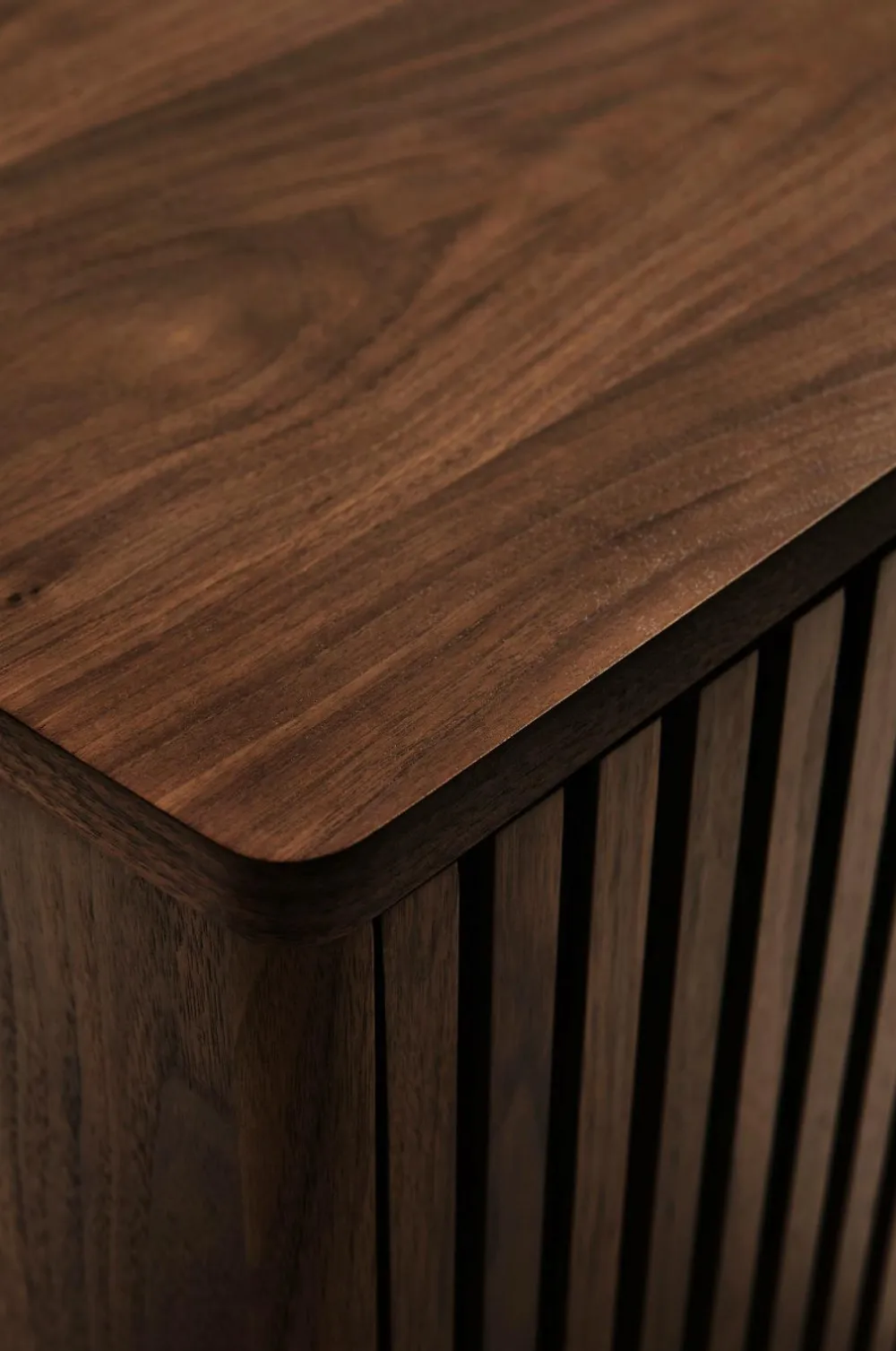 Solid og veludført med et tidløst design, det er sådan, vi vil opsummere Rue-møbelkollektionen. Denne skænk har en fin valnøddefinér, der tilfører klassisk attitude. De massive døre har velformede, lodrette ribber. Det giver dig helt skjult opbevaring, samtidig med at ribberne giver en spændende overflade, der skifter karakter, alt efter hvordan lyset falder. Lågerne er forsænket under toppanelet, hvilket giver skabet en slank kontur. De har softclosing-hængsler, og du åbner dem let med push-funktionen. Døre uden håndtag forstærker den stilfulde fornemmelse. De forreste hjørner er blødt afrundede.