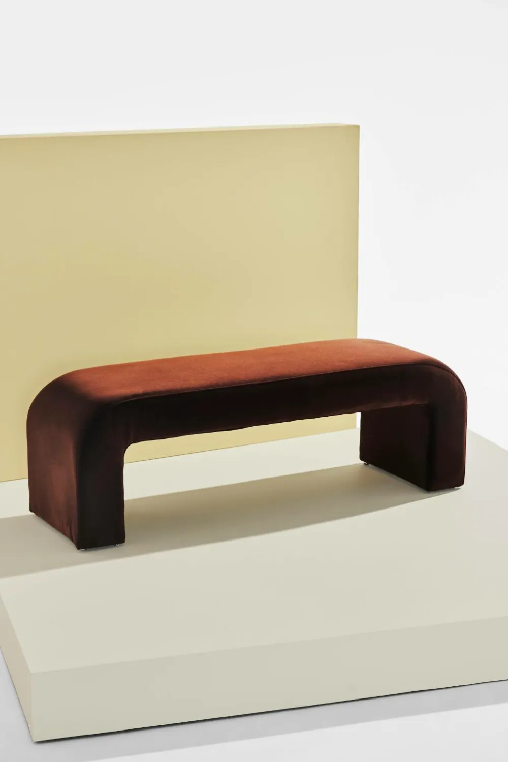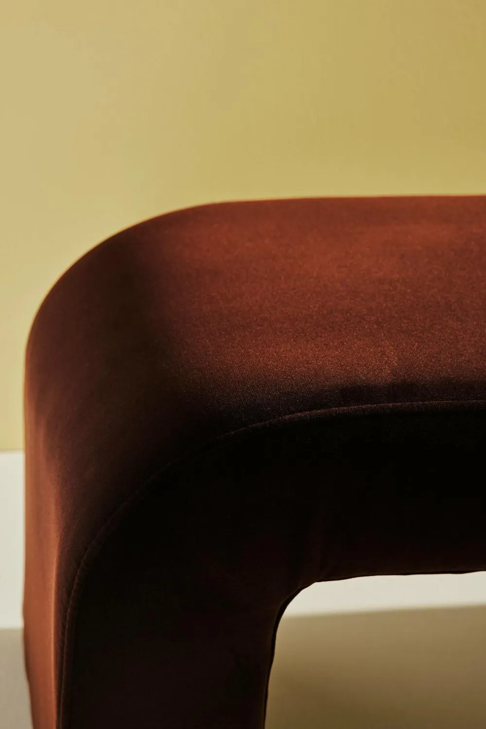 Bænk i lækker model med spændende form, med betræk af glat, fin velour som skinner i lyset.