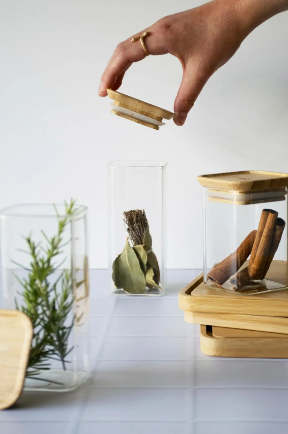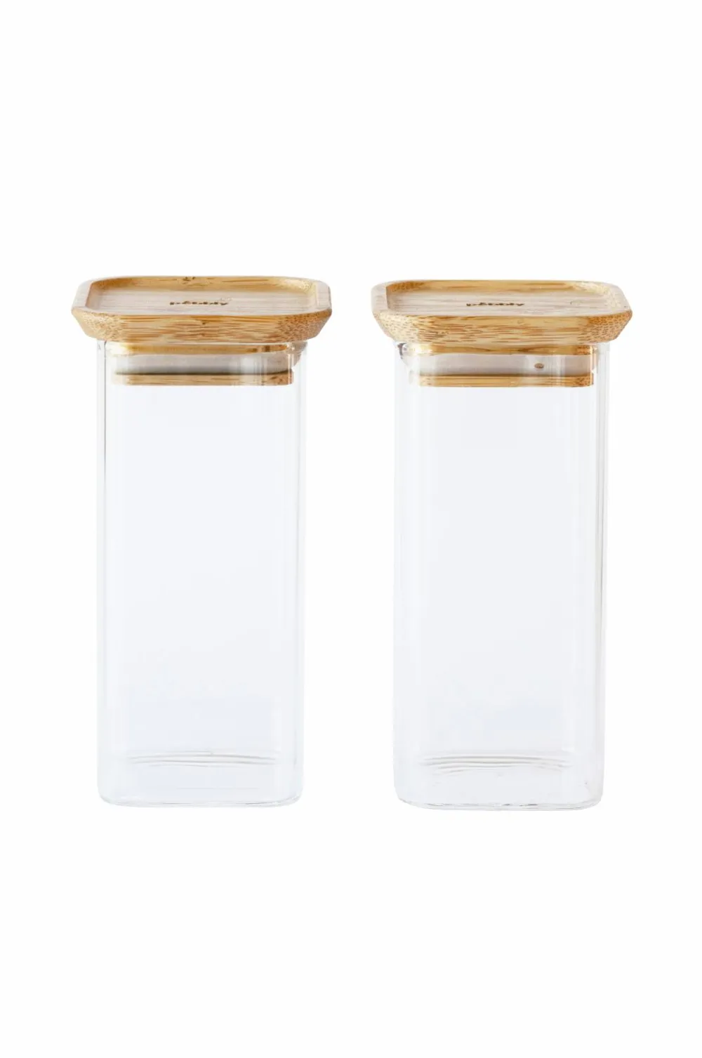 Denne stabelbare glasbeholder med bambuslåg i 2-pak er den perfekte løsning til at organisere din krydderihylde og bordplade og samtidig holde dine fødevarer friske. Denne beholder med bambuslåg er fremstillet af borosilikatglas af høj kvalitet og er holdbar, stilfuld og alsidig. Bambusstykkerne tåler ikke opvaskemaskine!