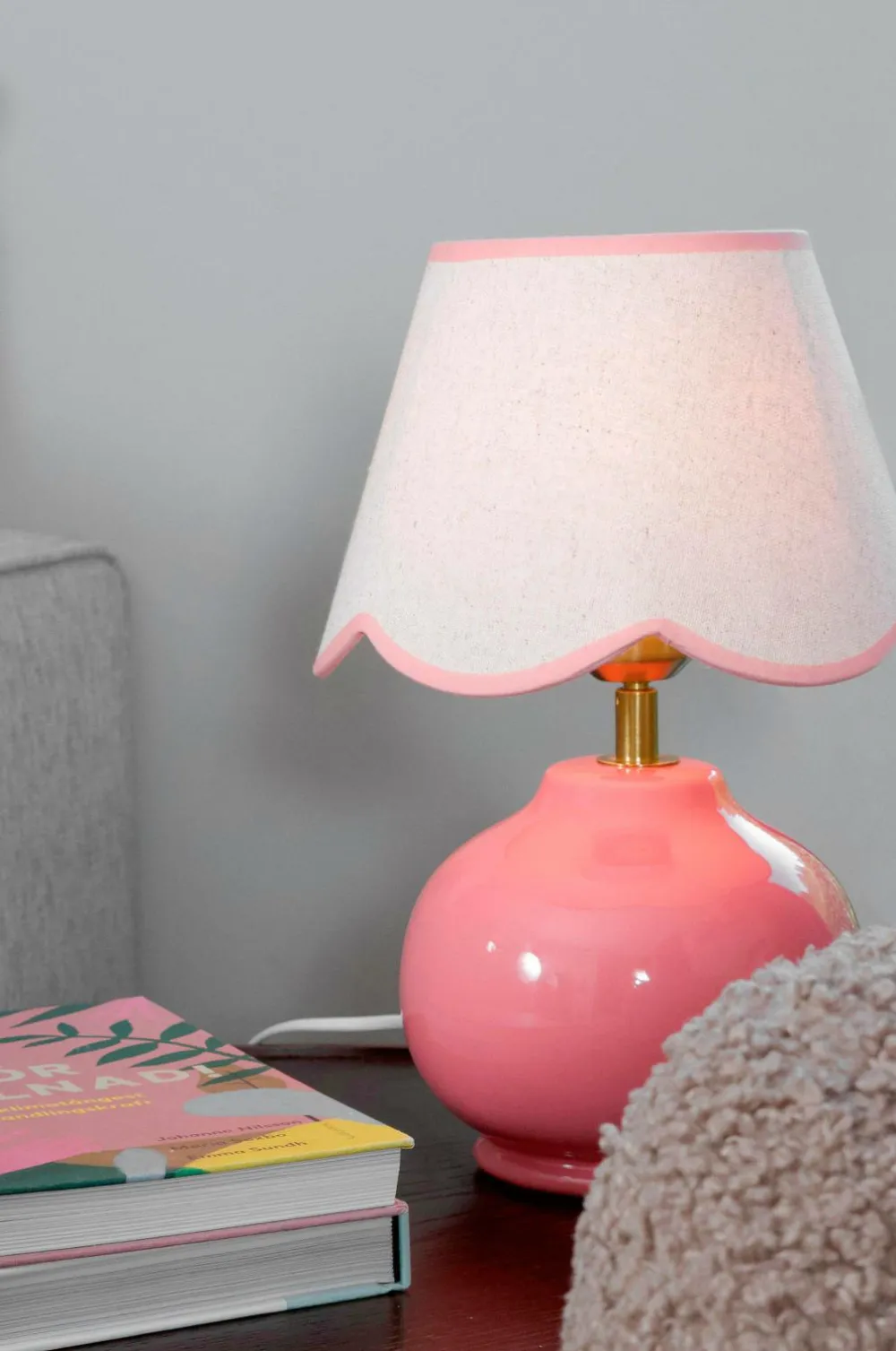 Nell Bordlampen er en komplet lampefod med matchende skærm. Den har en kugleformet keramikfod med en linnedlignende skærm, der har bølget kant med matchende trim. Lampens samlede højde er 35 cm, og den måler 23 cm i dybden og bredden. Plastkablet er 170 cm langt og har en afbryder 30 cm fra lampefoden. E27-fatning. Maksimalt 40w. Ip20. Lyskilde medfølger ikke.